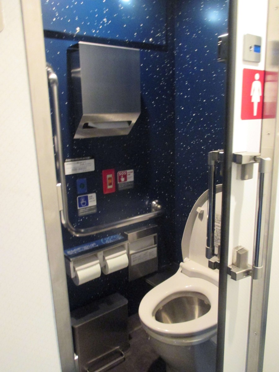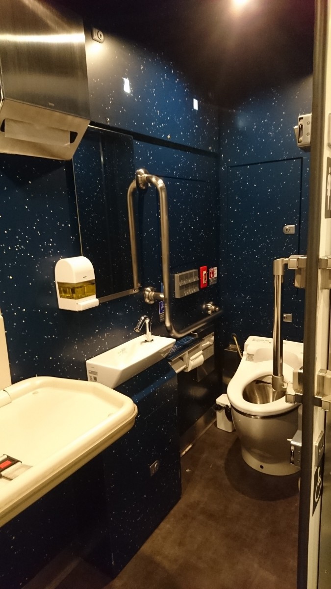 2号車ソラフネ 多目的トイレ 便器に向かって左側にL字型手すりあり ペーパータオルの位置153センチ 高いので注意が必要