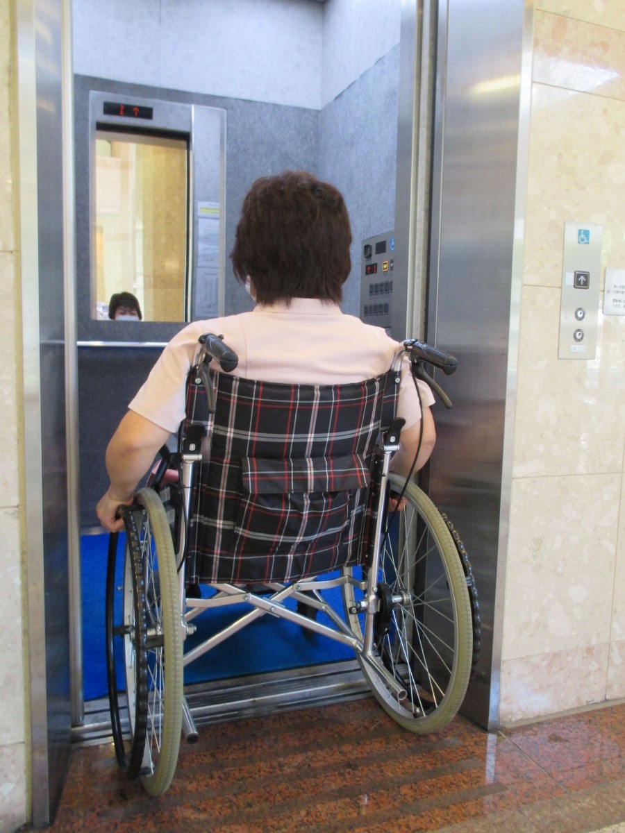 1階 エレベーター 入口幅77センチ 点字表示、音声案内、後方確認用鏡あり