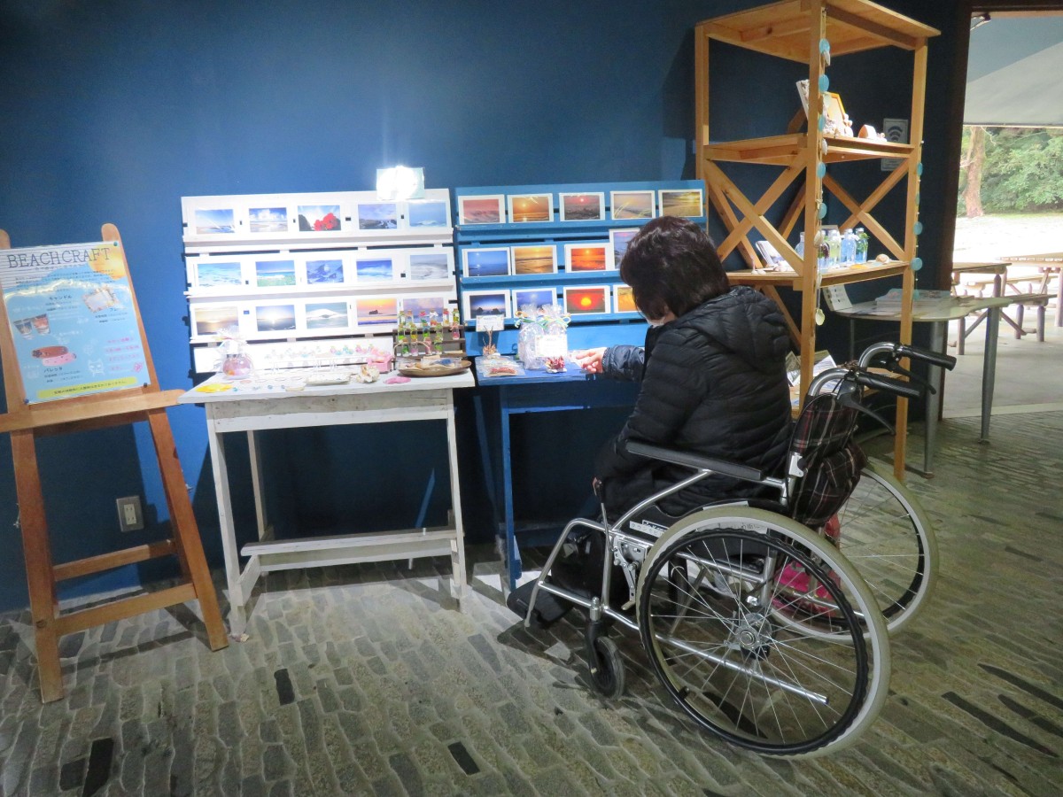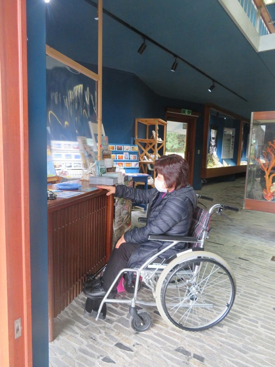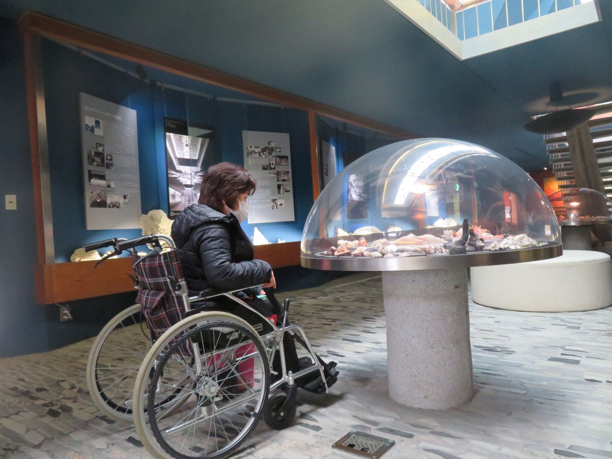 ・海のギャラリーの2階への動線は階段で、エレベーターはない。車いす等で2階に上がる場合、スタッフに声をかければサポートできるが、常駐が1名になる事があるため可能な限りになる。