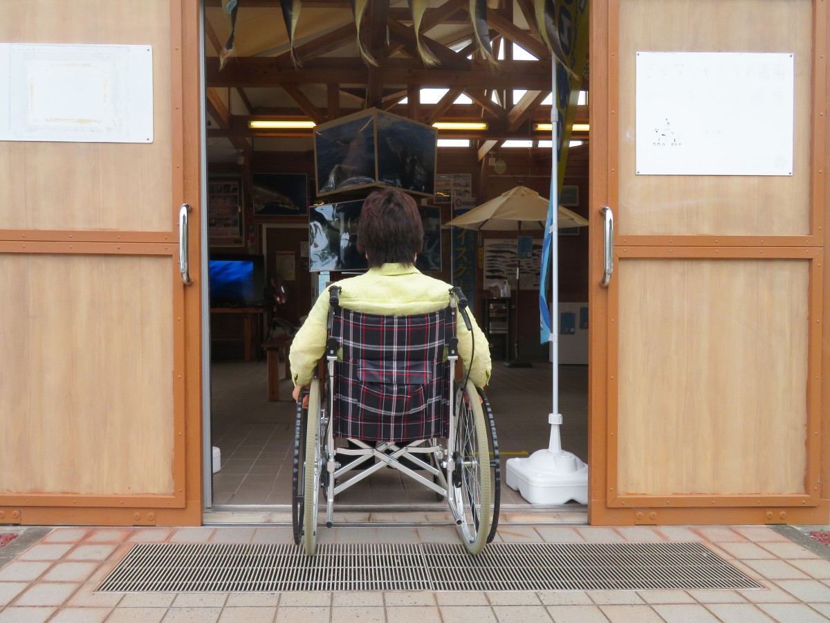 管理棟 正面入口 スライド戸(受付時は開放) 入口幅はとても広い 段差なし