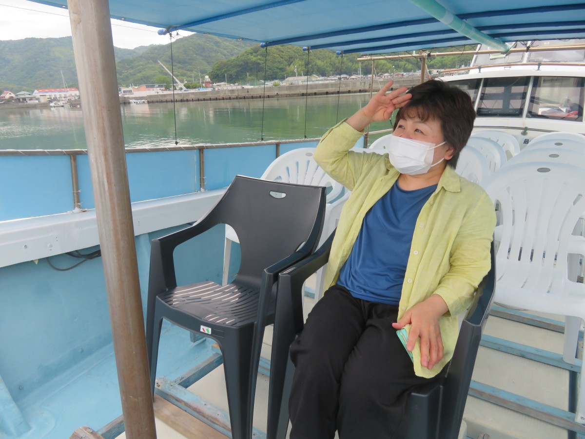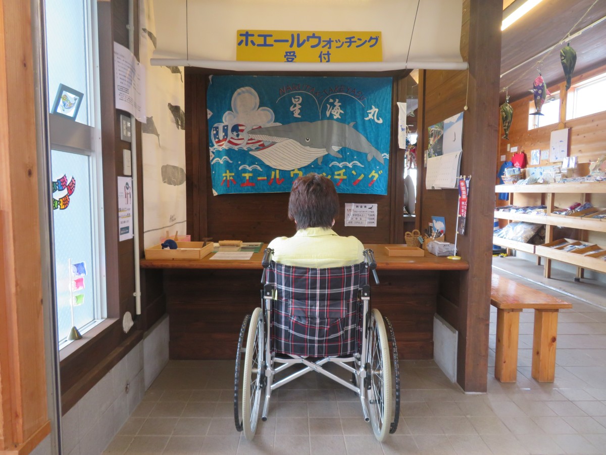 乗船の様子 船内トイレ 開き戸 入口幅40センチ 段差あり 外側の段差23センチ、内側の段差24センチ 船上で歩行に不安がある人は船長に声がけすれば揺れが少なくなるよう一時停船してくれる