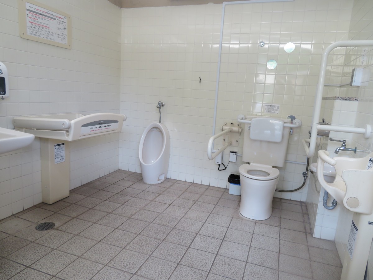 トイレ棟(しおかぜ公園) 車いす対応トイレ 便器に向かって右側にL字固定式、左側にU字可動式手すりあり ベビーシート、ベビーチェア、幼児用小便器あり