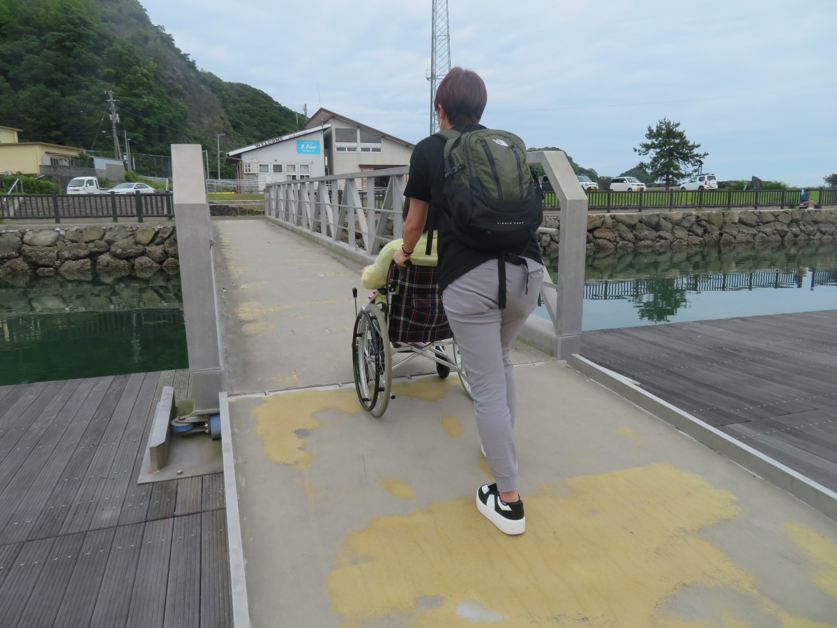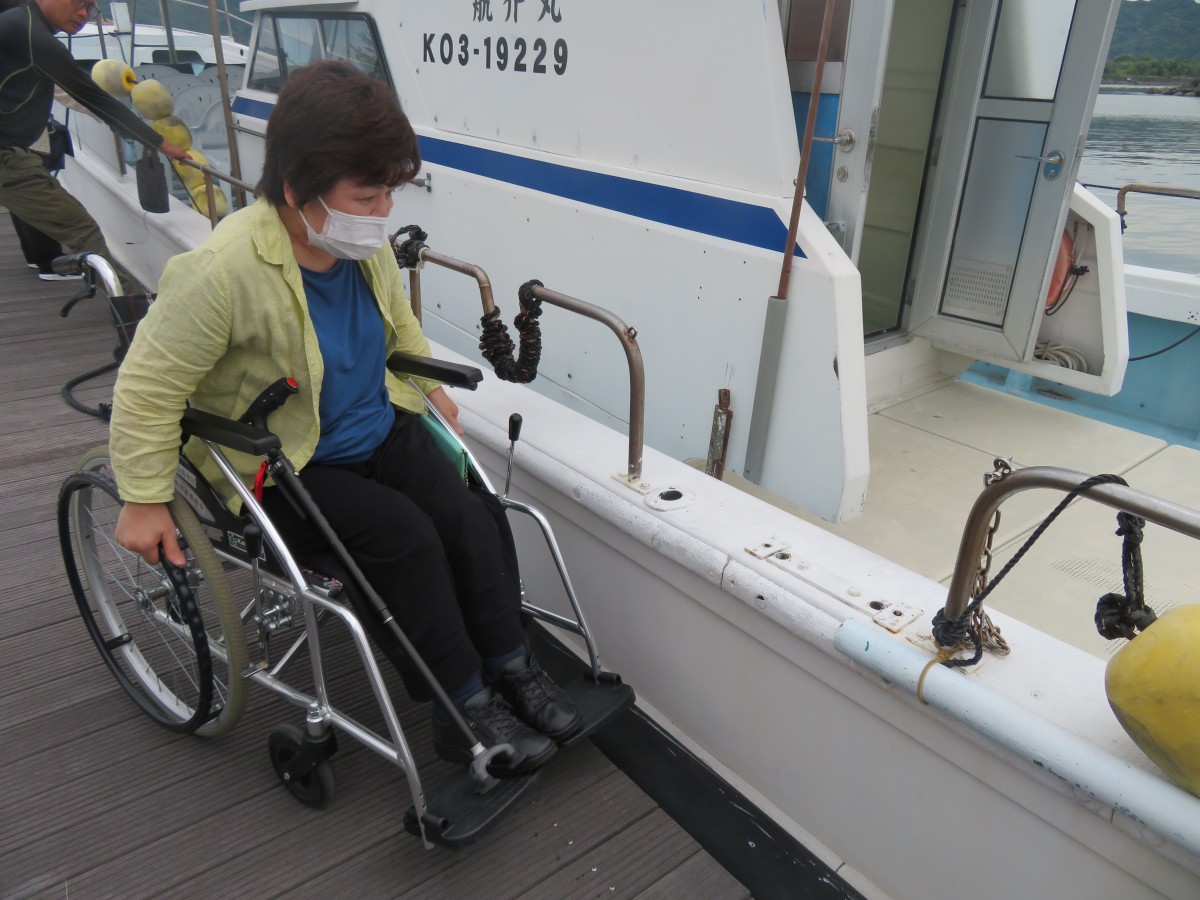 乗船の様子 船縁(ふなべり)をまたいで乗降する 乗降時は可能な限り船を寄せてくれるが、船と浮桟橋には隙間があるので注意が必要 サポートが必要な方は、予約時に要相談