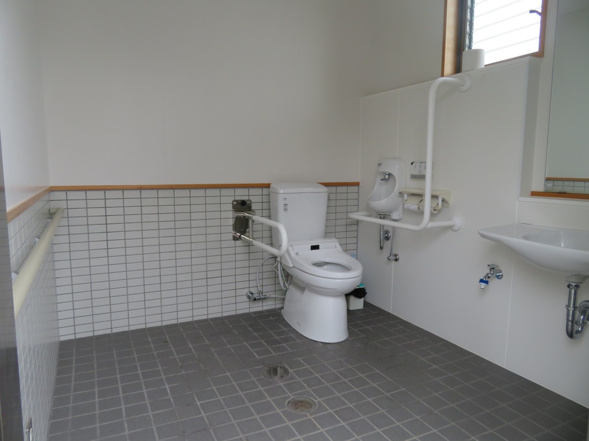車いす対応トイレ(管理棟横) 便器に向かって右に固定L字、左に可動式U字手すりあり