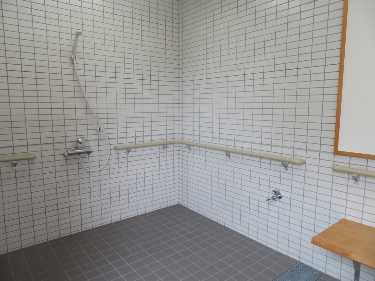 車いす対応シャワー室(管理棟横) スライド戸 入口幅87センチ 段差無し 固定ベンチあり