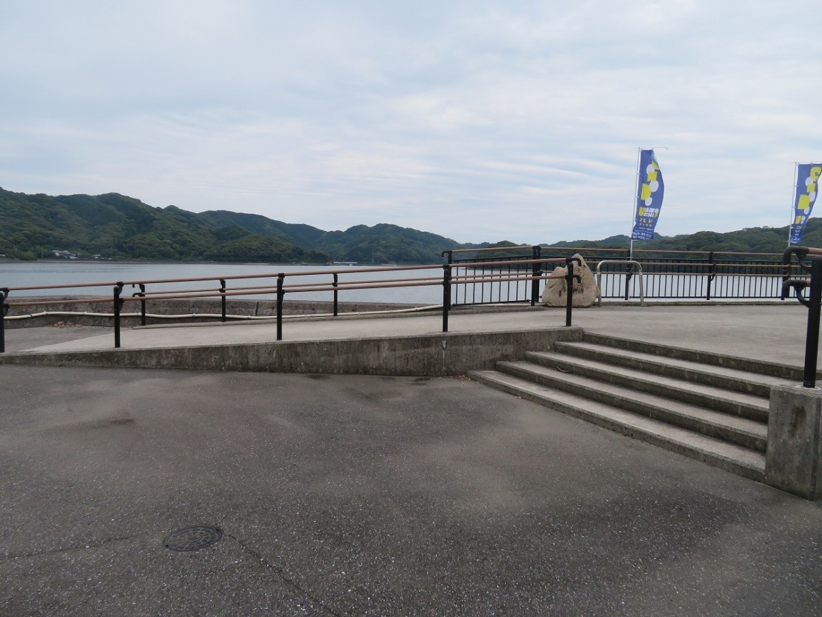 管理棟から海上アスレチックへの経路 管理棟前 階段 5段 スロープ、手すりあり