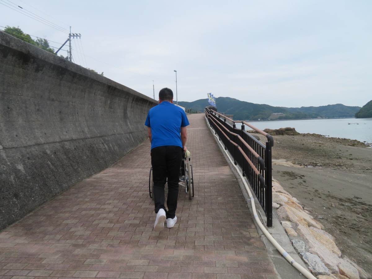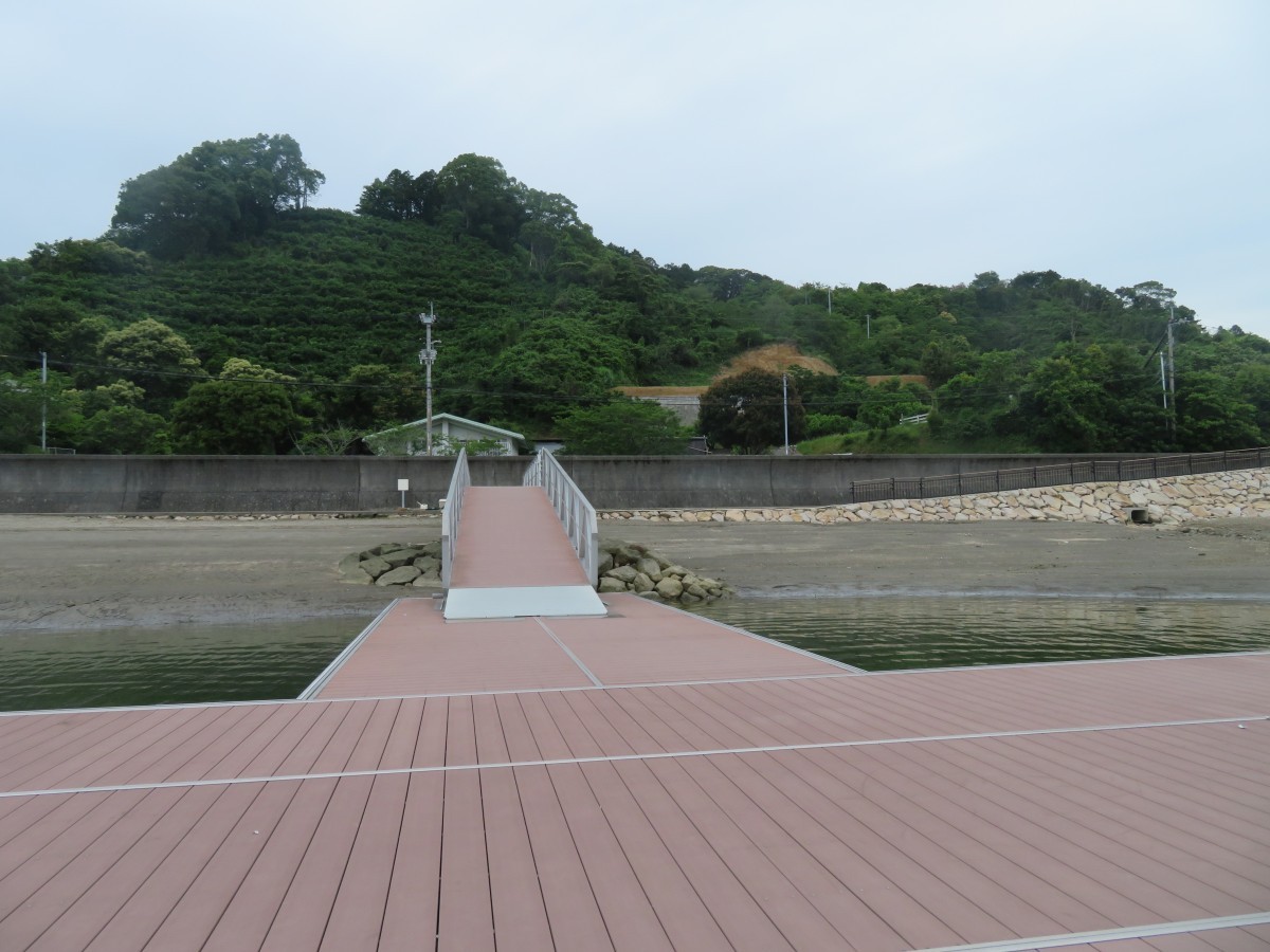 浮桟橋出口の様子 傾斜あり 傾度は満潮時で10度 車いすの場合は、介助者必要
