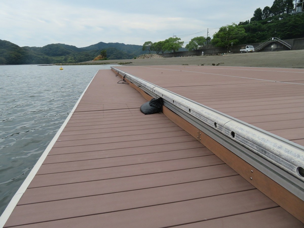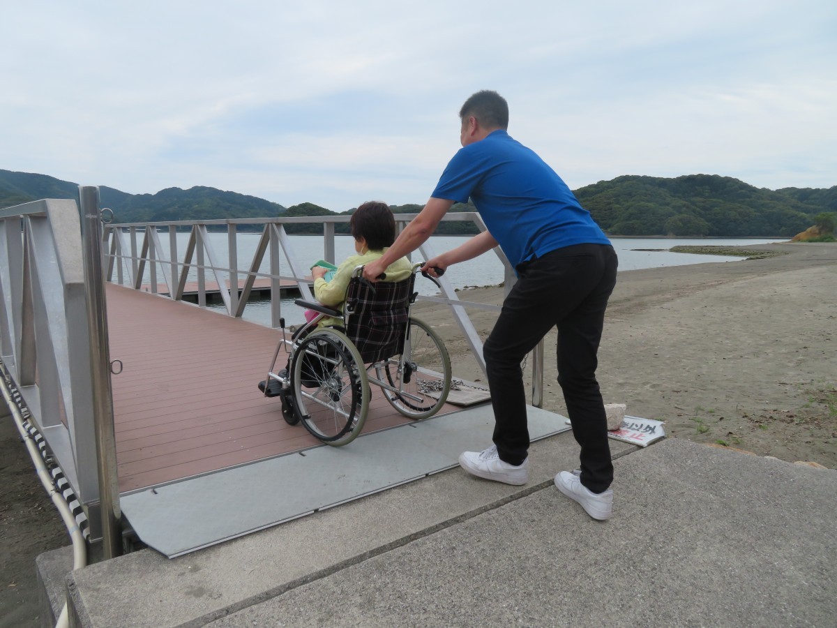浮桟橋入口の様子 段差2センチ スロープあり 斜度15度 車いすの場合は、介助者必要