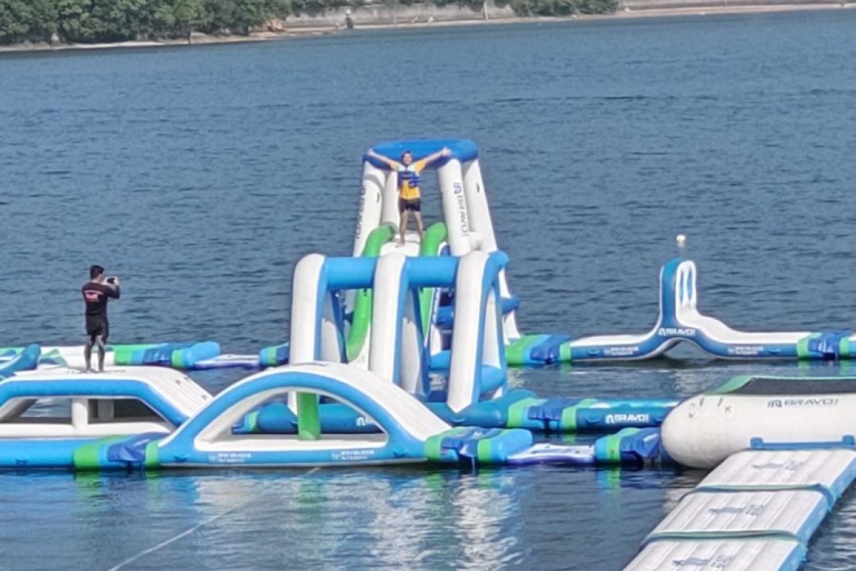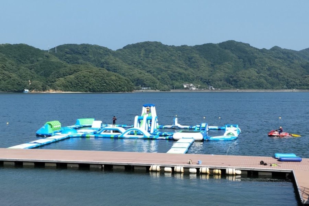 海上アスレチックへの様子 大小様々なパーツから出来ており、大人から子どもも楽しめる