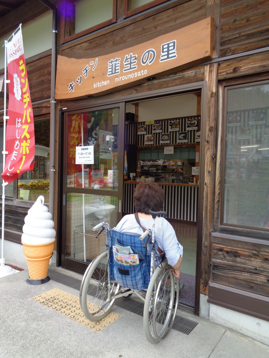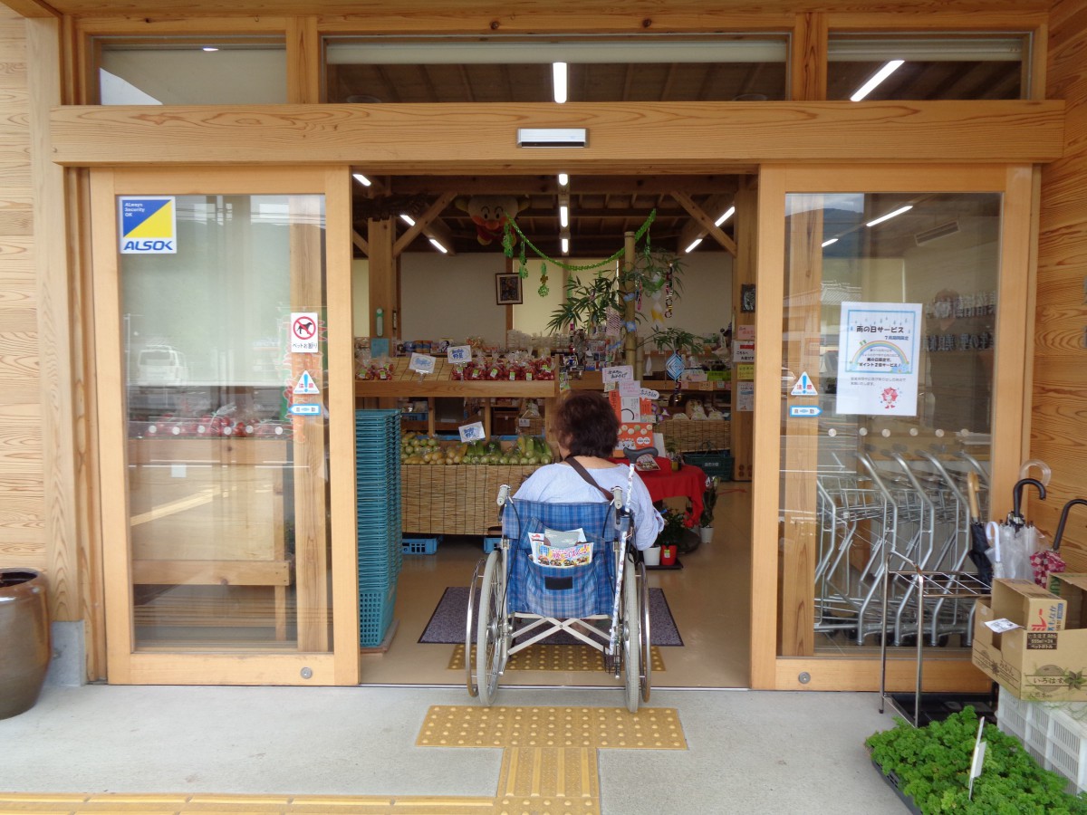 韮生の里 美良布直販店の正面入口 常設スロープ 幅120センチ 長さ185センチ 傾斜緩やか 点字ブロックあり