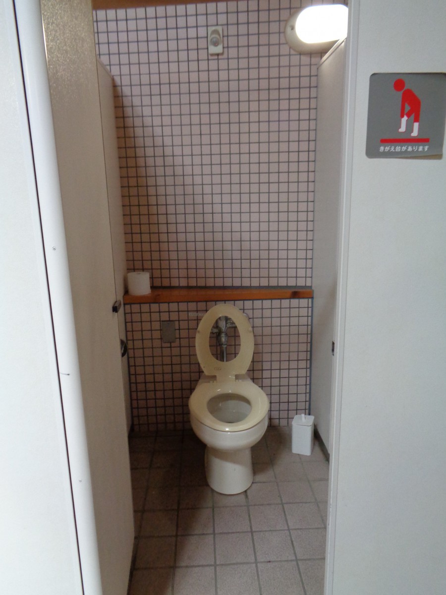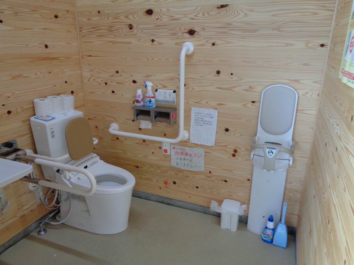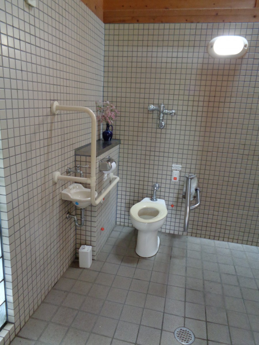 集落活動センター交流スペース北側入口の車いす対応トイレ ベビーチェア、手すりあり 18:00~翌朝7:00(夜間)は使用不可。