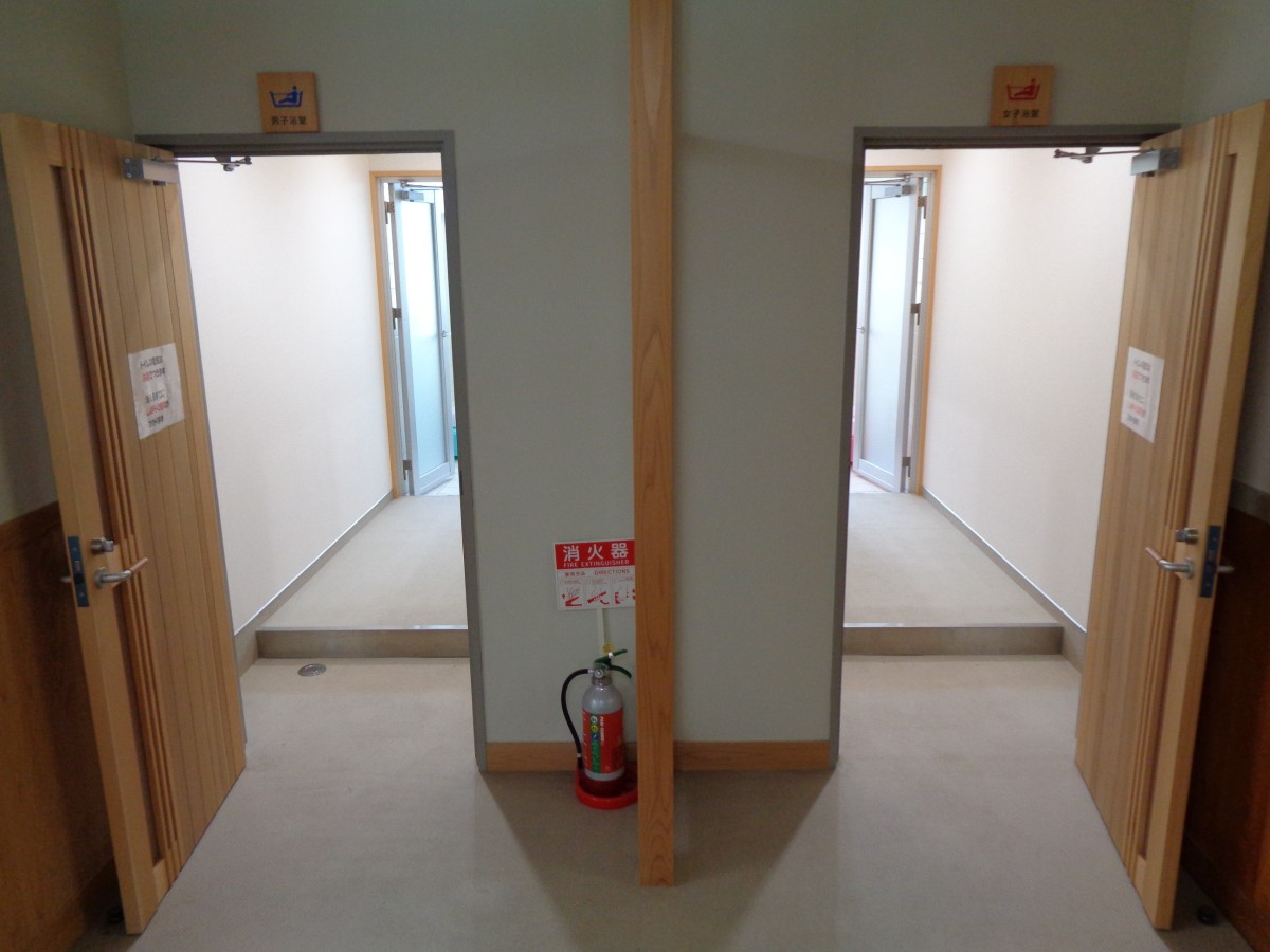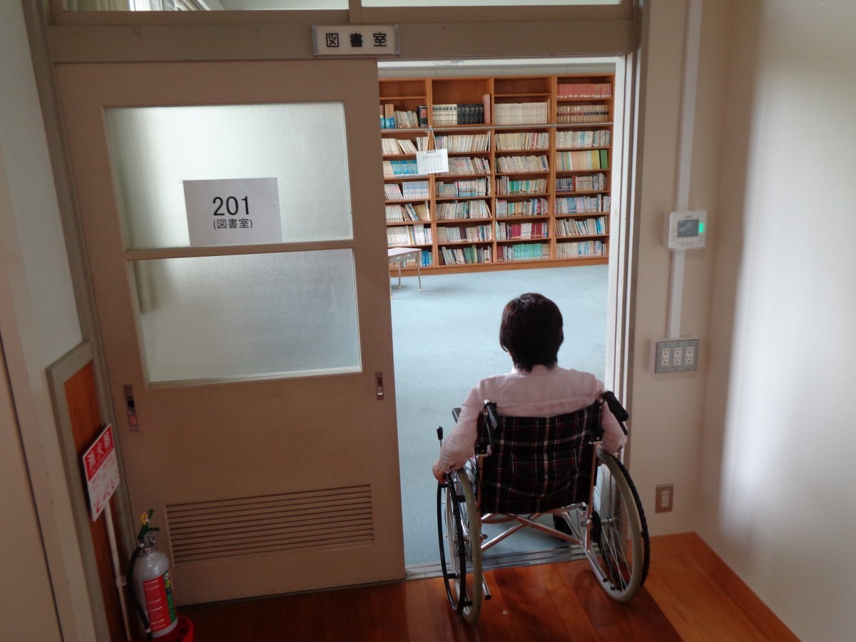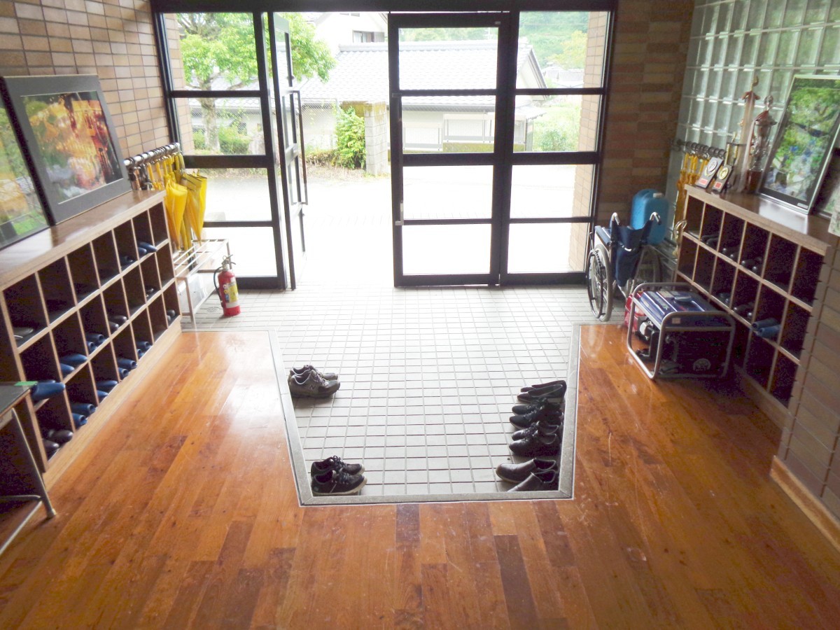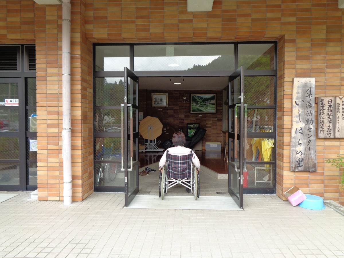 正面入口 開き戸 入口幅は片開き時80センチ、両開き時十分広い 段差あり 3段 スロープあり