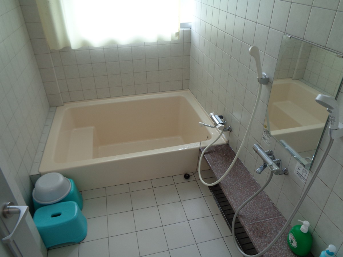 1階 浴室の様子 介護用備品貸出なし、浴槽の深さ57.5センチ 介助者も入れる広さ