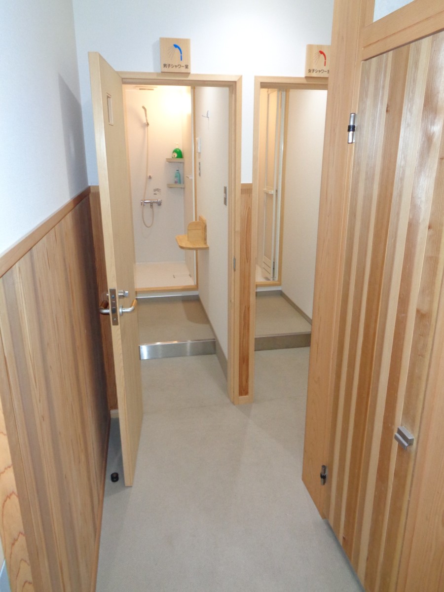 1階 シャワー室 開き戸 入口幅57センチ 脱衣所手前に段差あり12センチ