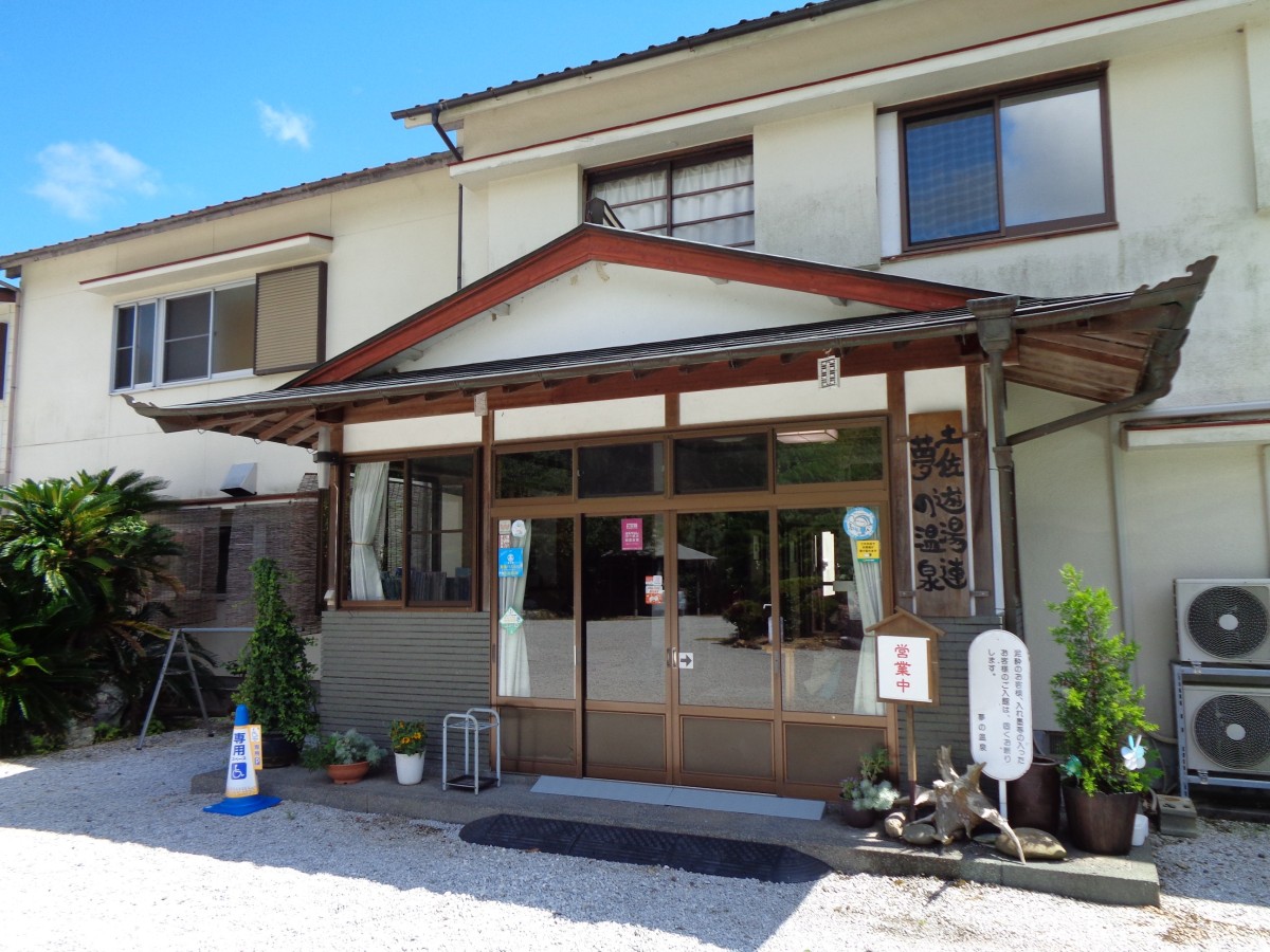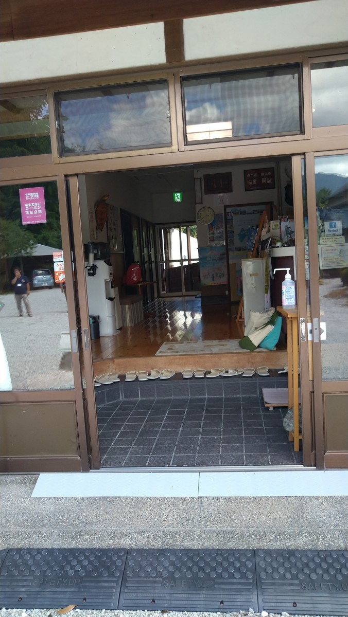 正面入口 開き戸 入口幅は十分広い 入口前に段差解消スロープがあるが、勾配あり