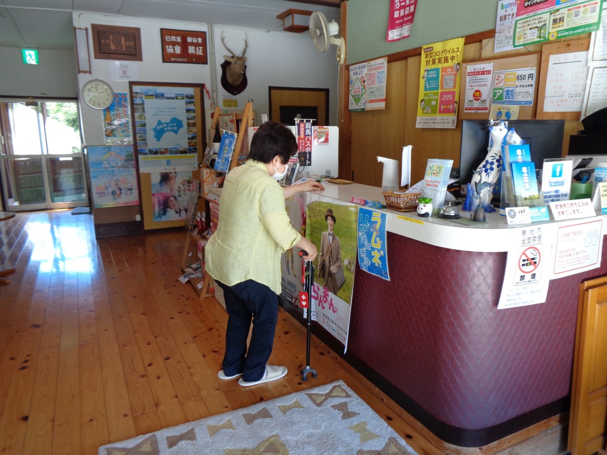 受付 カウンター高さ95.5センチ 受付正面の椅子に腰掛けてのチェックイン可 英語対応スタッフがいない時は翻訳アプリで対応