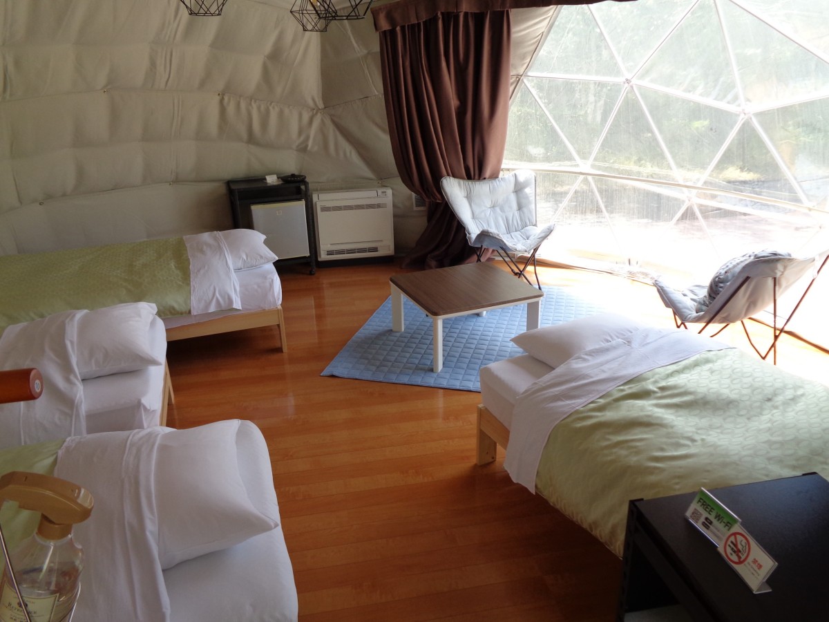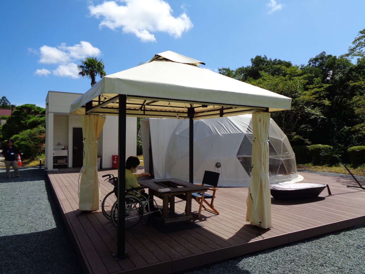 屋外 ドームテント デッキ部分に上がるのに段差あり 高さ17センチ トイレ、洗面、シャワー設備はテントのすぐ横の建物にある
