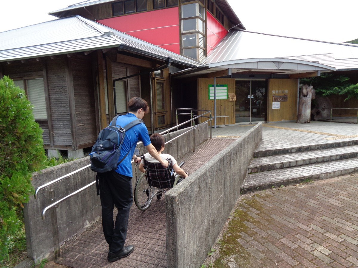 正面入口 入口前の階段とスロープの様子 スロープはやや急な傾斜で、介助者がいた方がよい