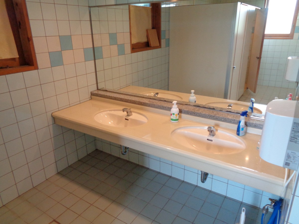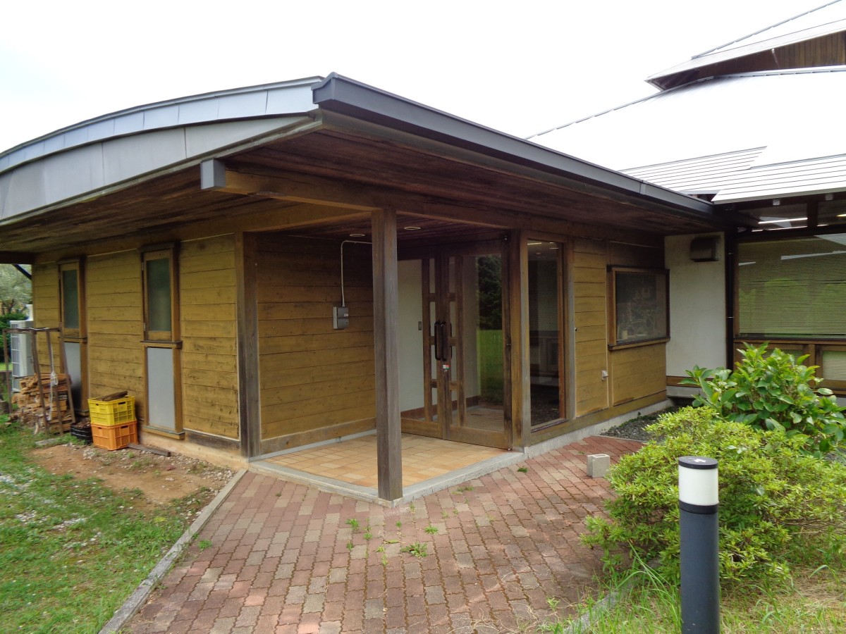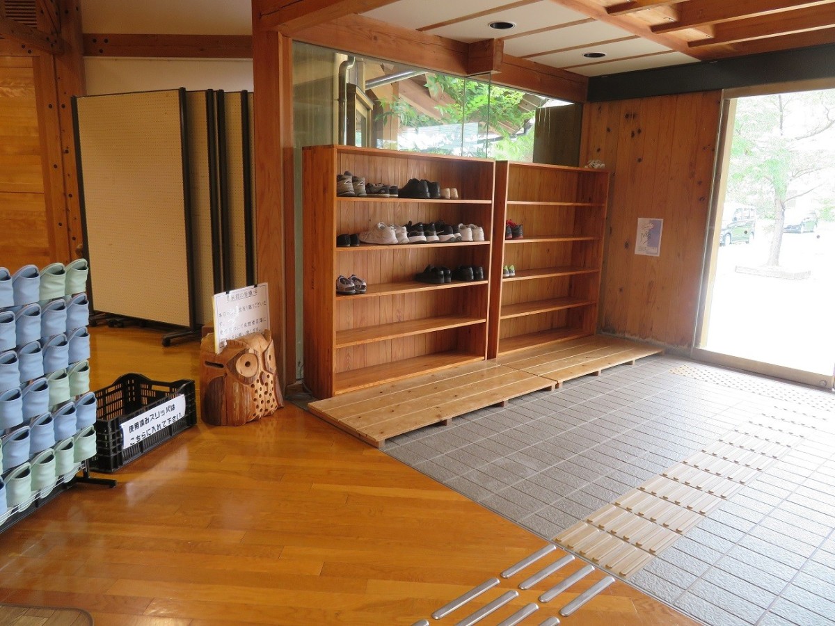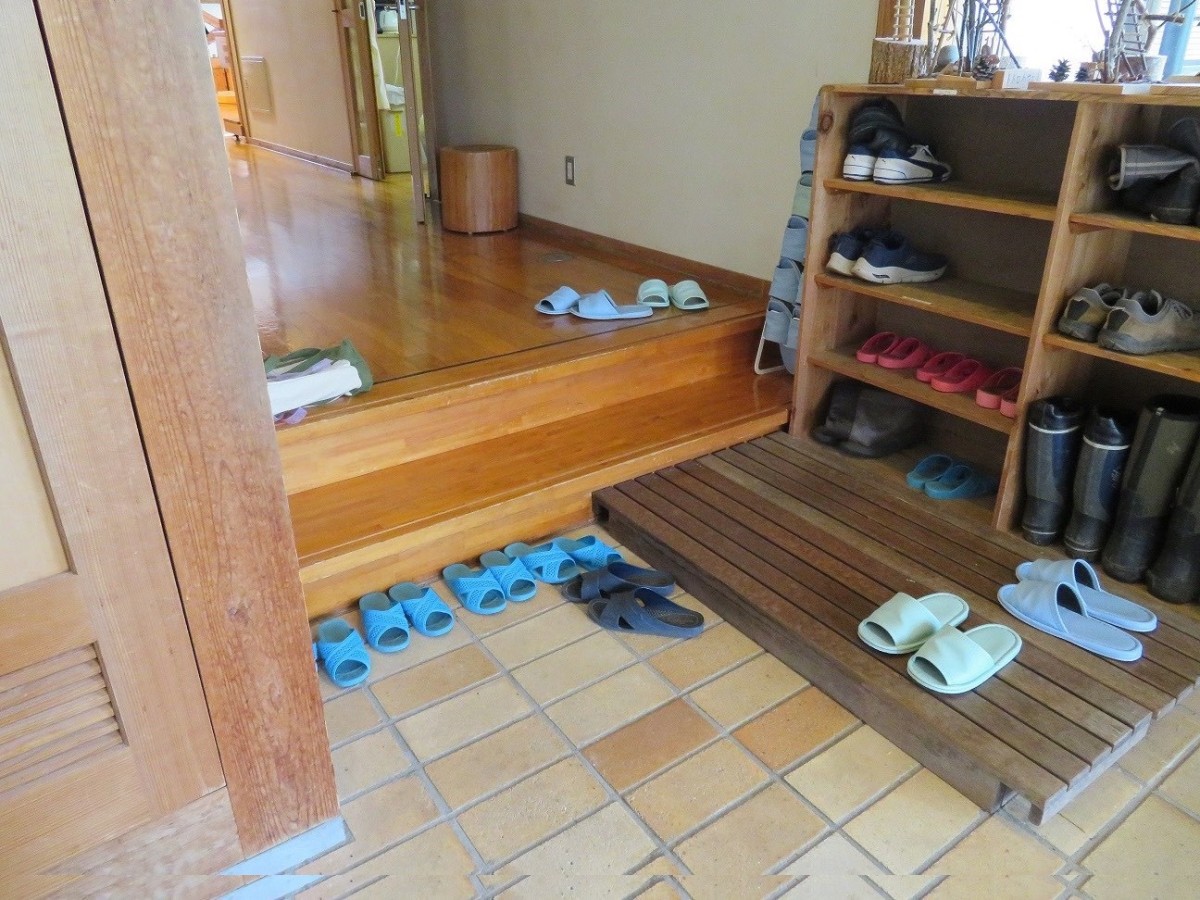 裏側の出入口 屋内側 写真の靴脱ぎ場の手前、すぐ左が一般トイレになっており、野外活動をした人が、土足でそのままトイレに行けるようになっている