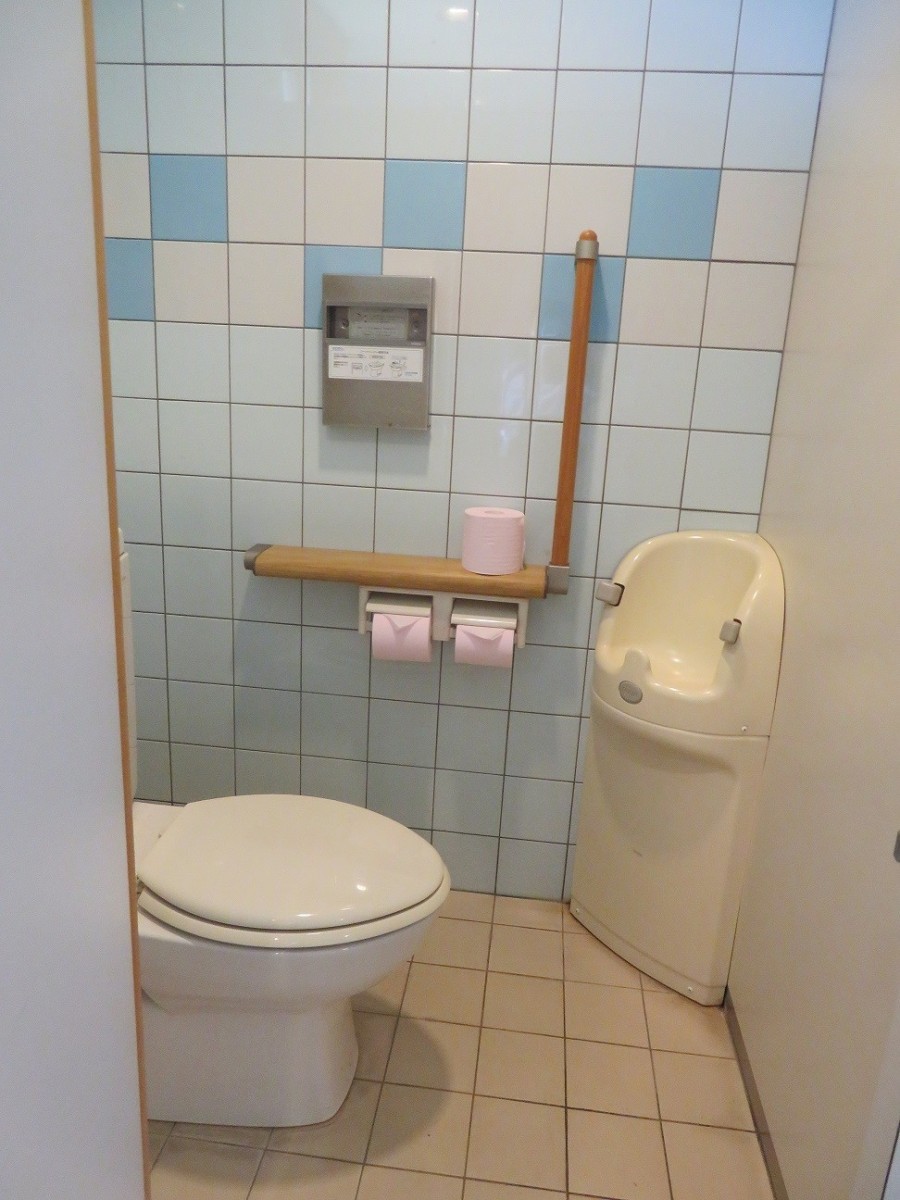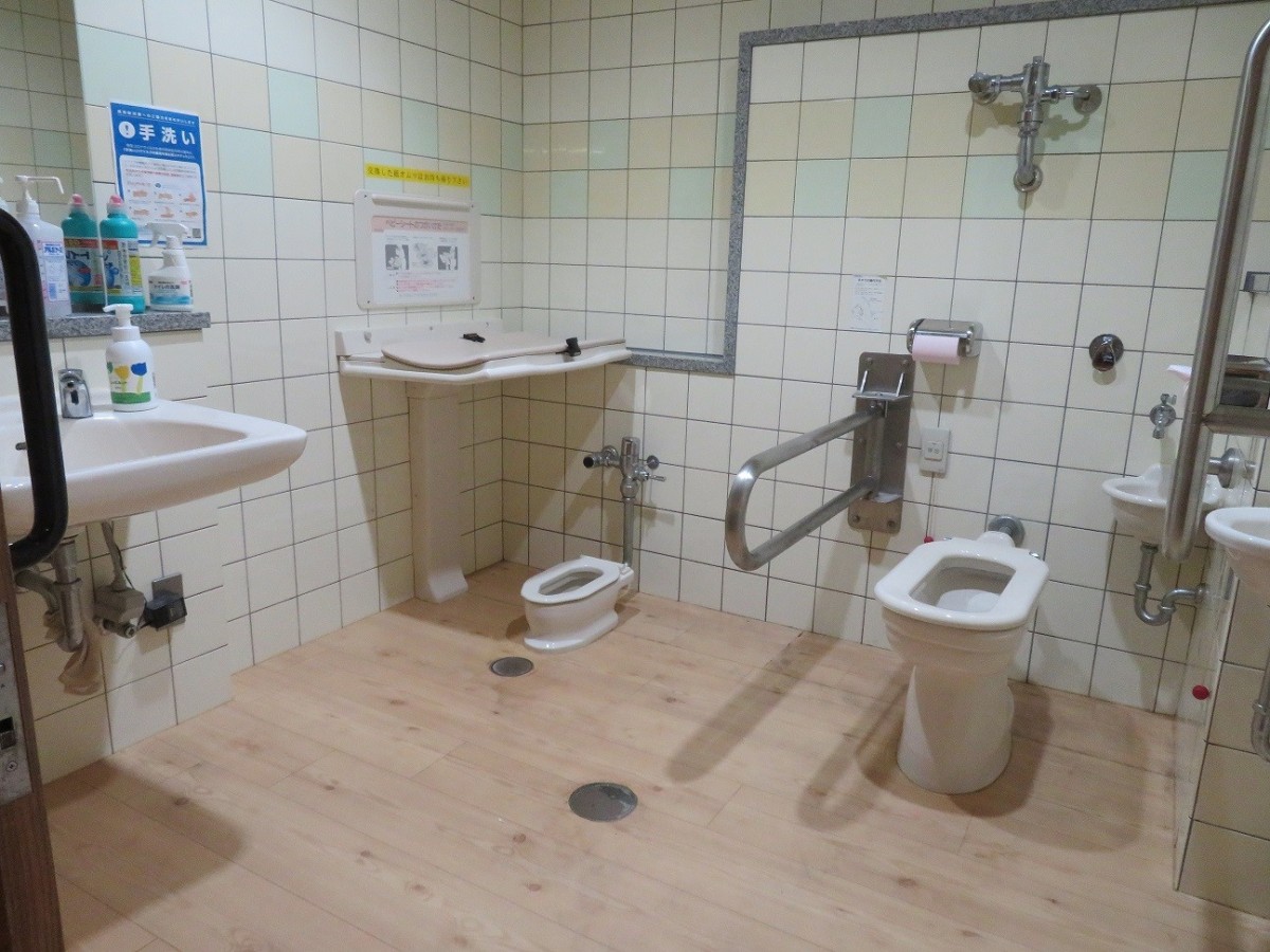 多機能トイレ 入口は木製のスライドドアで開け閉めが少し重め 手すり、ベビーシート、子ども用便器あり