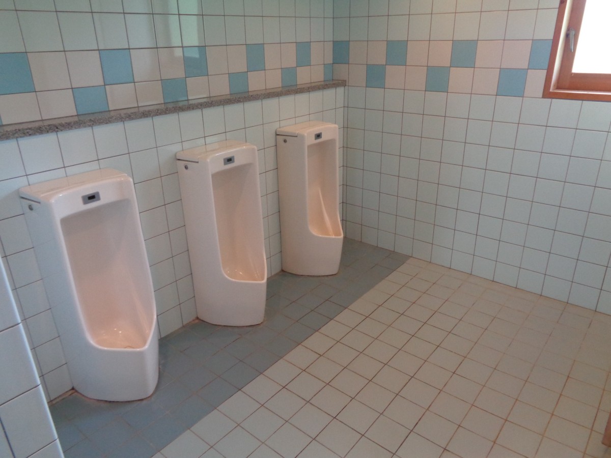 男性用一般トイレ 一般トイレは男女とも土足、室内からはトイレ用のスリッパあり 床は清掃時の排水のため、ところどころ傾斜している