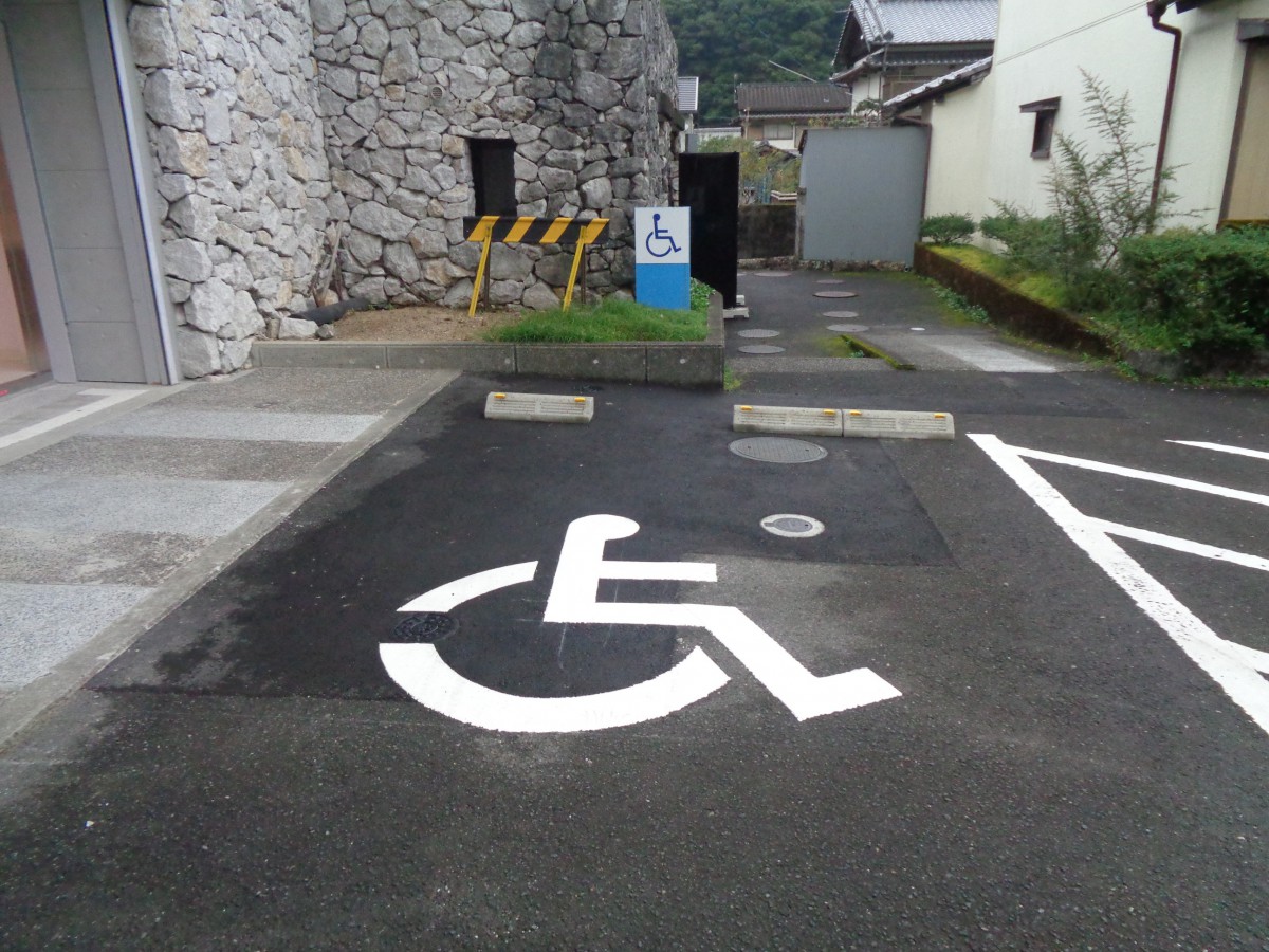 地場産センター身障者用駐車場スペースが1台 その他の駐車場は佐川町立青山文庫に3台、地場産センターに12台が使用可 いずれも「観光用駐車場」(緑の看板が目印)