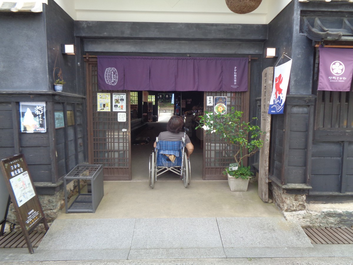 施設正面入口 手前に傾斜あり 道路からすぐの路面の傾斜は16度 次に6~8度傾斜している スライド戸 入口幅123センチ ドア下段差なし
