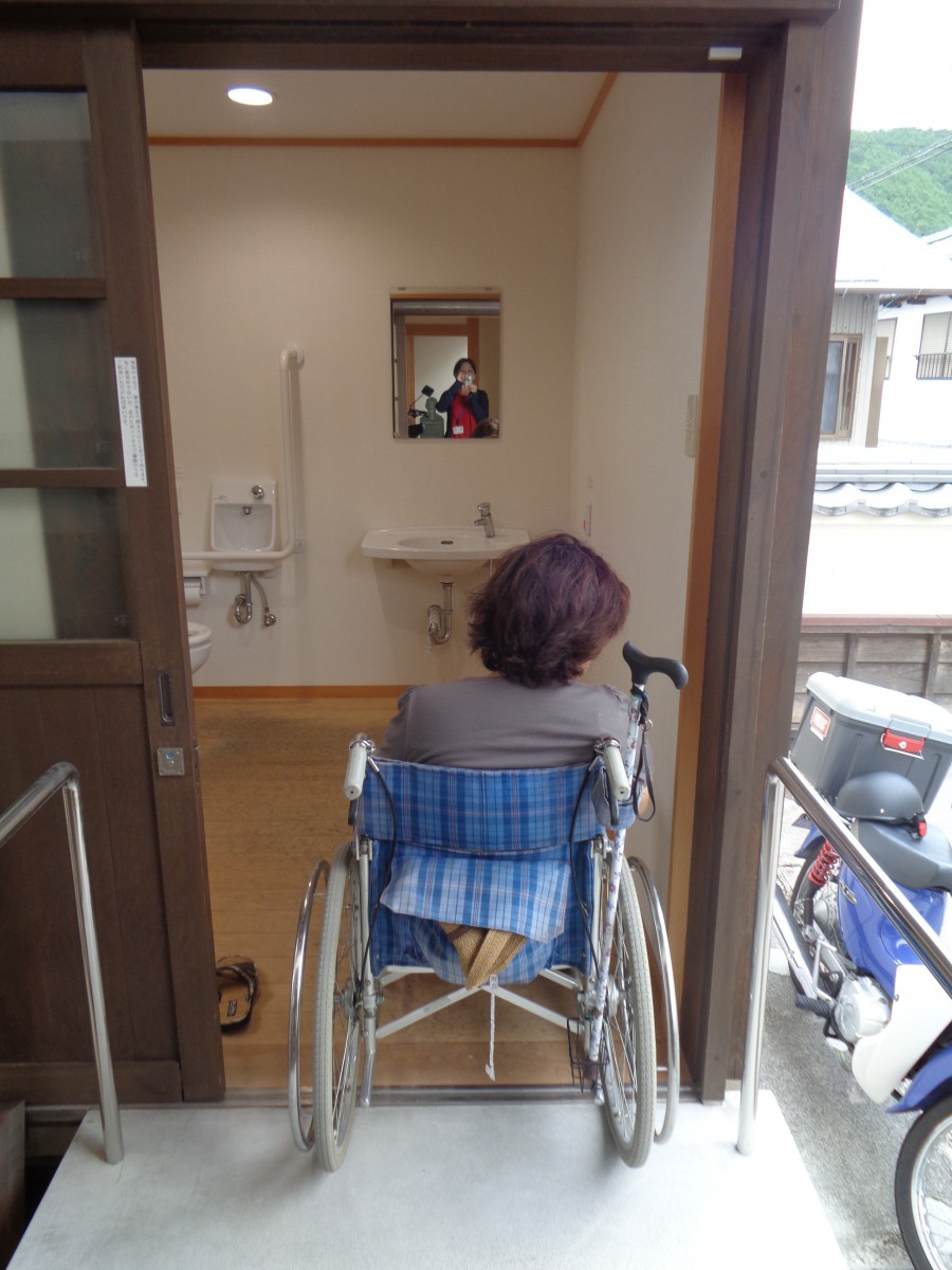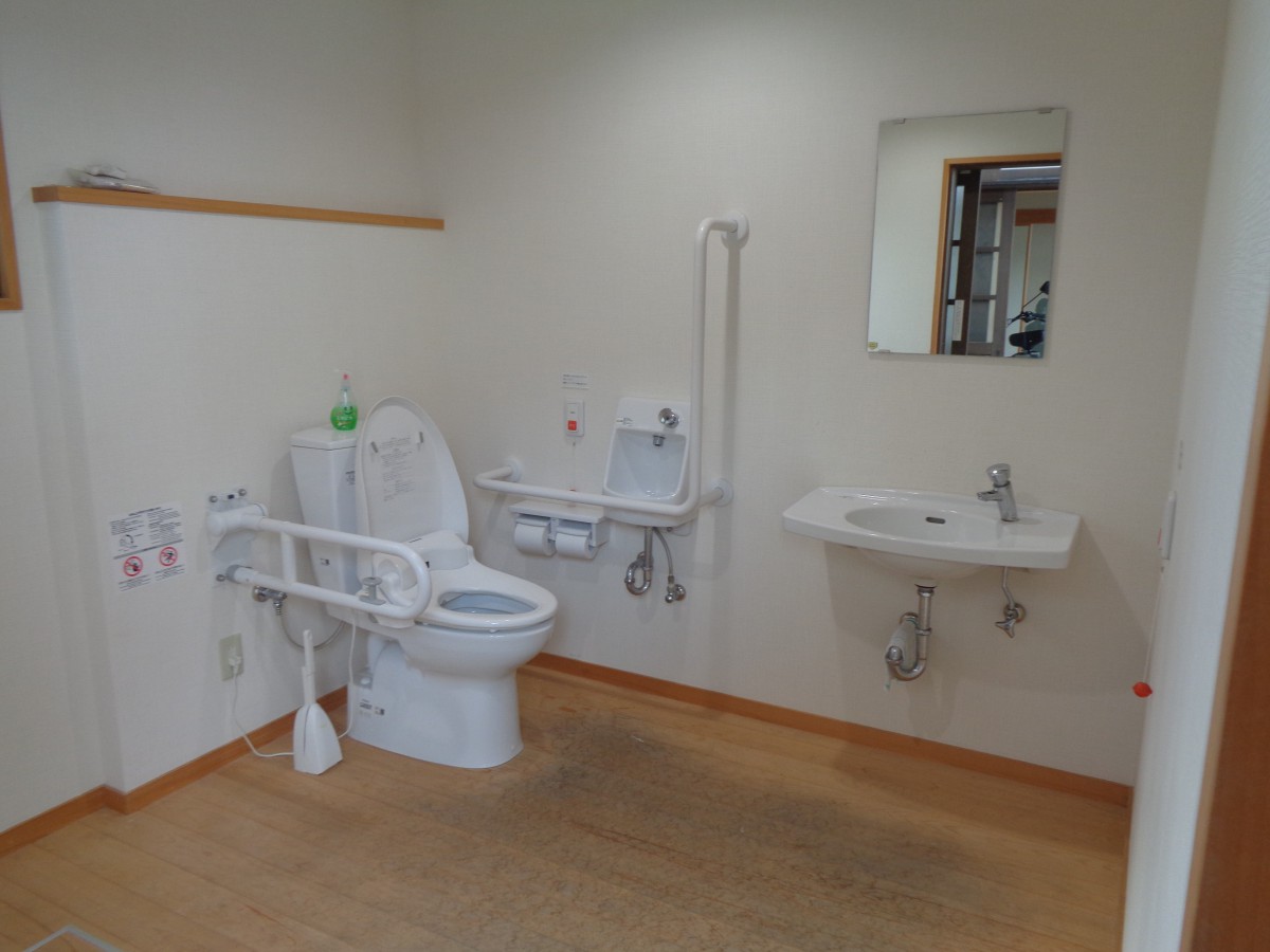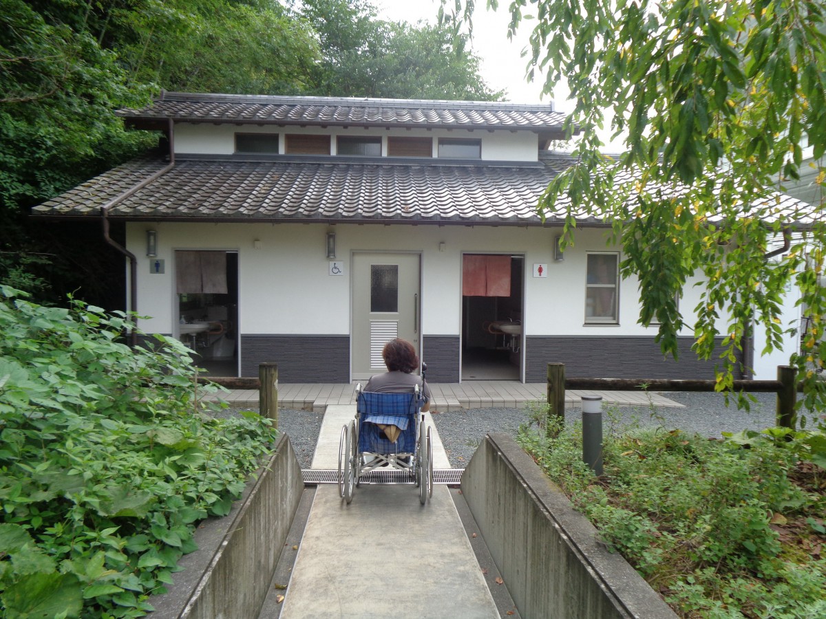 隣接のトイレ棟 車いす対応トイレ スライド戸 入口幅87センチ 段差なし