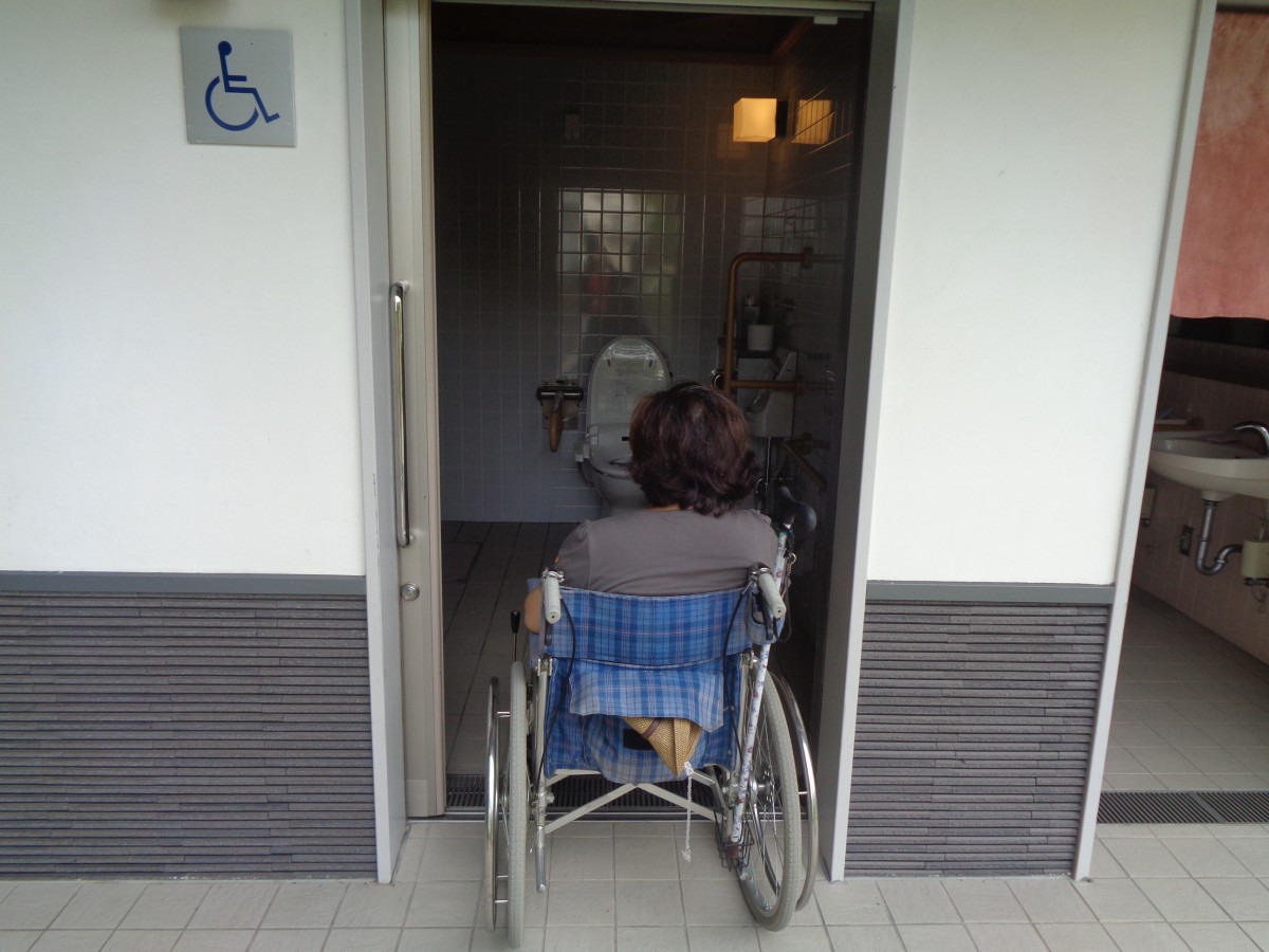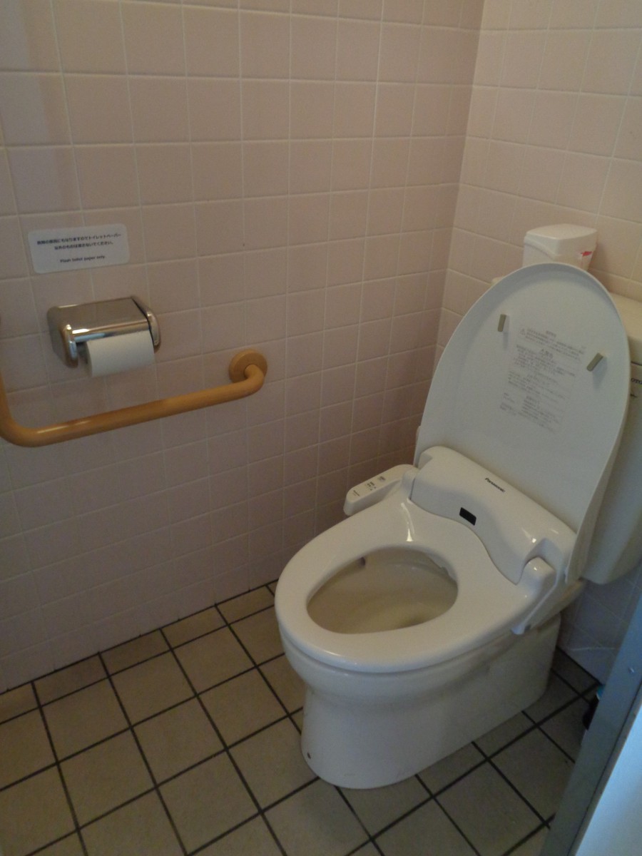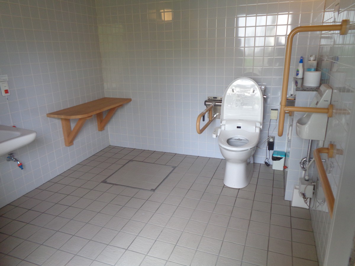 トイレ棟の車いす対応トイレ 手すりは向かって右側L字 左側U字 温水洗浄便座 操作パネル便座横 車いすで回転できる広さが十分ある 個室内に荷物棚あり