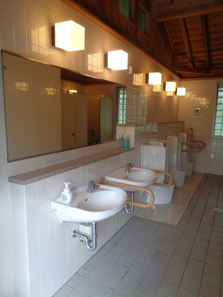 男性用一般トイレ 入口開放 段差なし 洗面台に手すりあり 小便器一基 個室和式トイレは正面に手すりあり