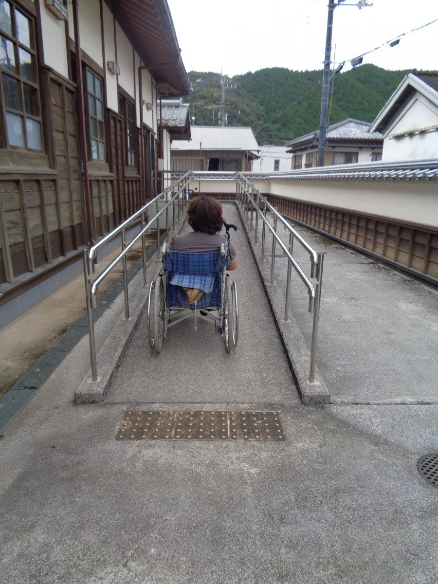 施設からトイレ棟まで通路幅120センチ 傾斜4~5度 段差なし