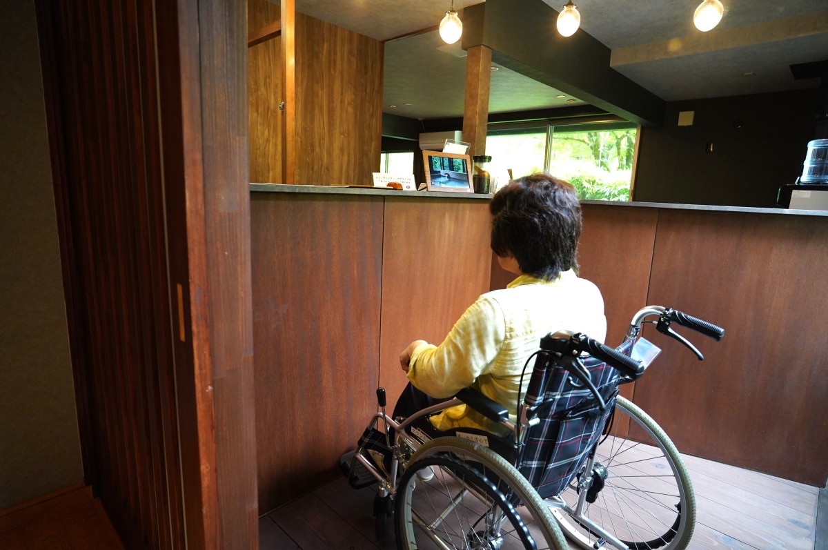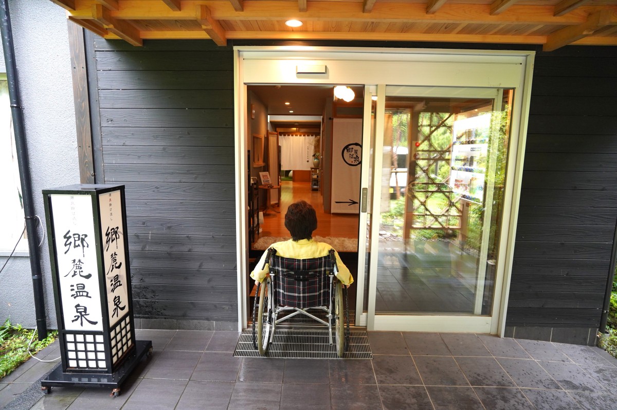 正面入り口の様子 入口幅87センチ 館内は土足禁止だが、車いすはタイヤを拭いて上がることができる