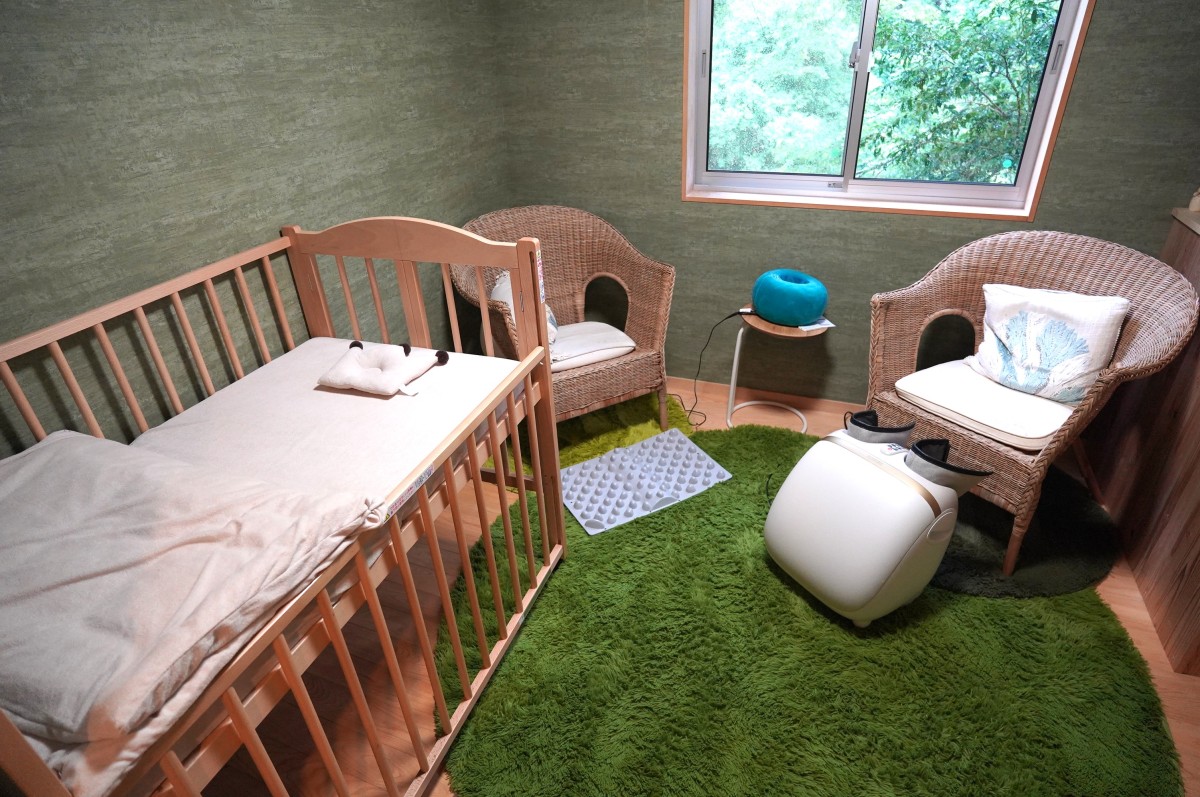 1階 healing room(ヒーリングルーム) ベビーベッドを備えており、施錠して授乳室としても使える 授乳室として使いたい場合はご相談ください