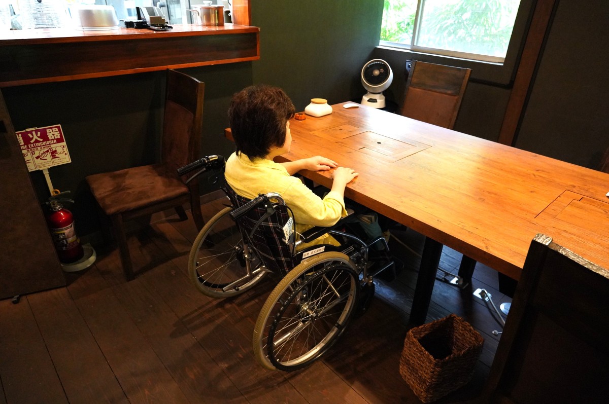 1階 食堂の様子 食堂内は専用スリッパになる(車いすはタイヤを拭いて利用) テーブル下の高さ67センチ