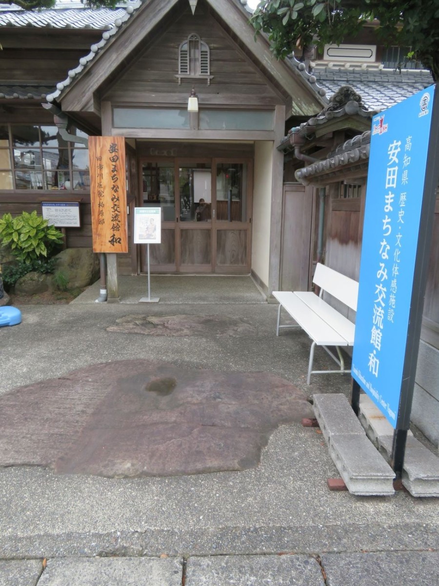 旧市川医院側 企画展入口の様子 入口手前に石があり凹凸になっている 入口幅は十分広く、敷居は段差がある(5.5センチ)