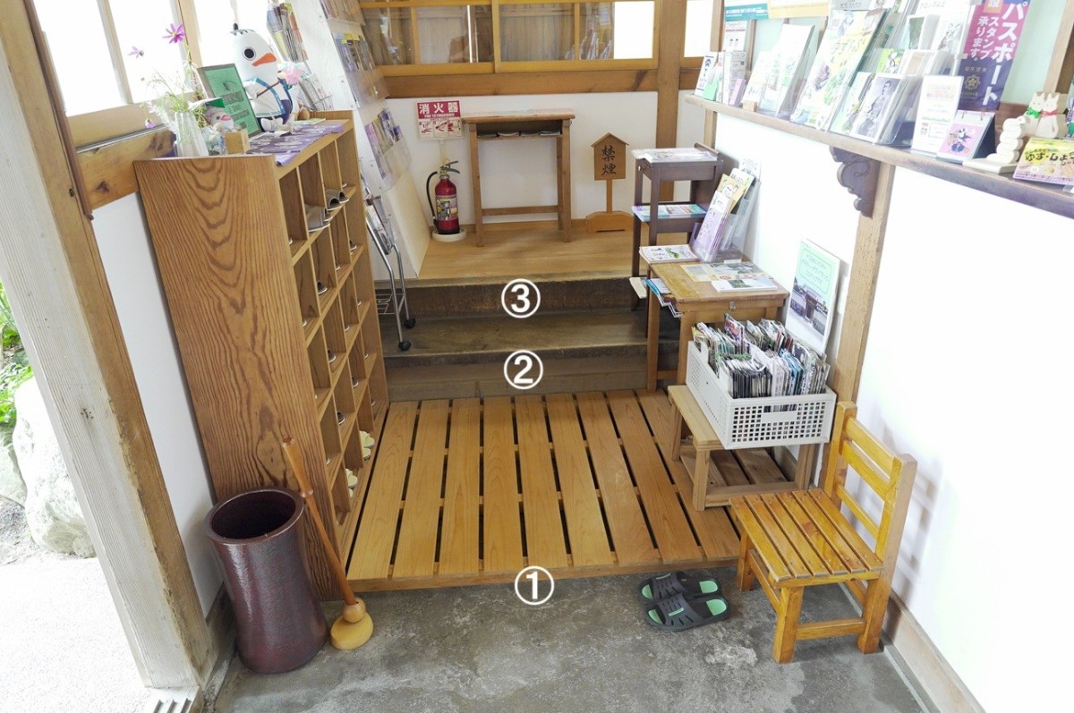 旧市川医院(企画展)側 室内への上り口は、急な段差が3段ある 手前から①9センチ、②23センチ、③18センチ
