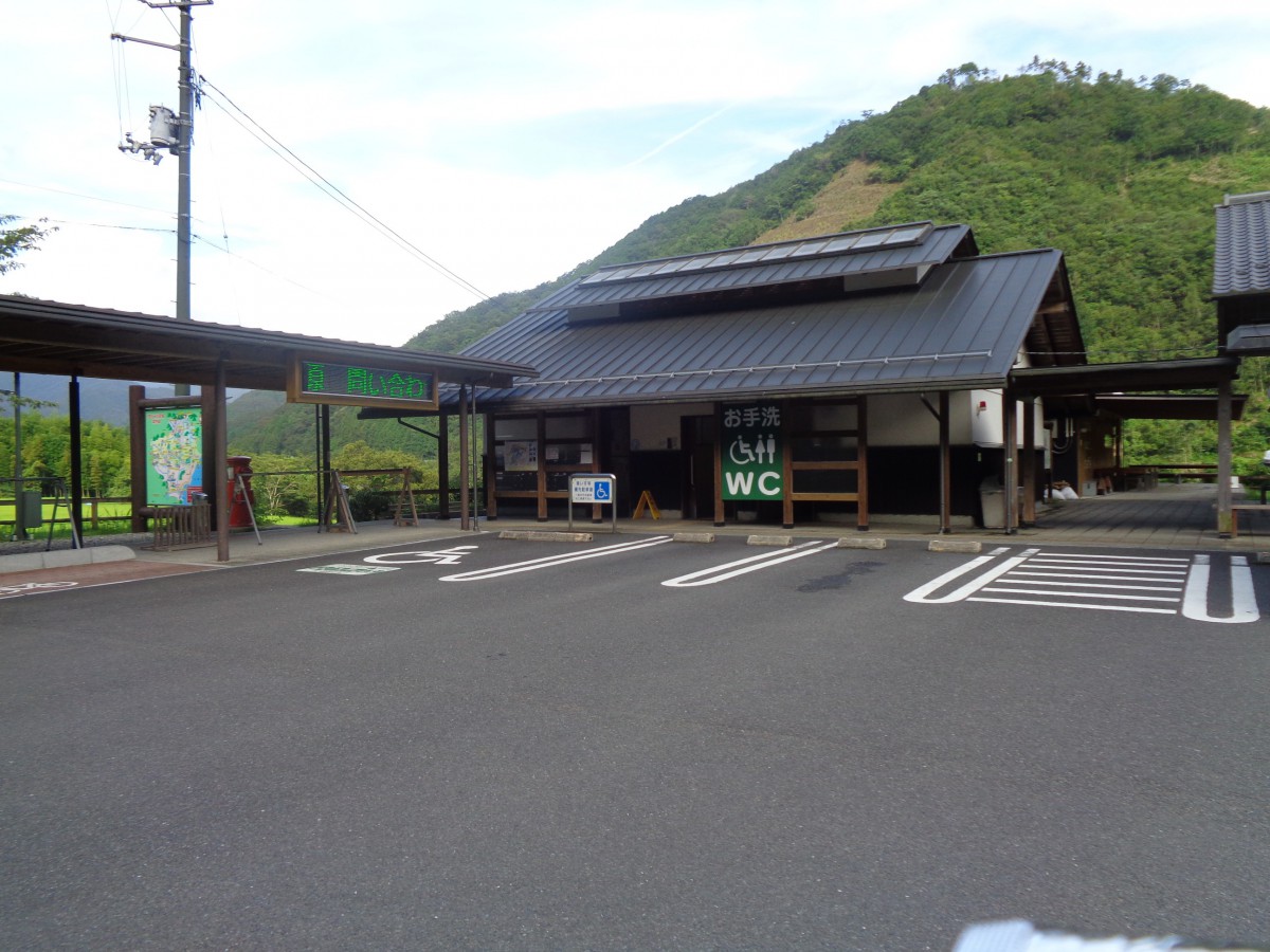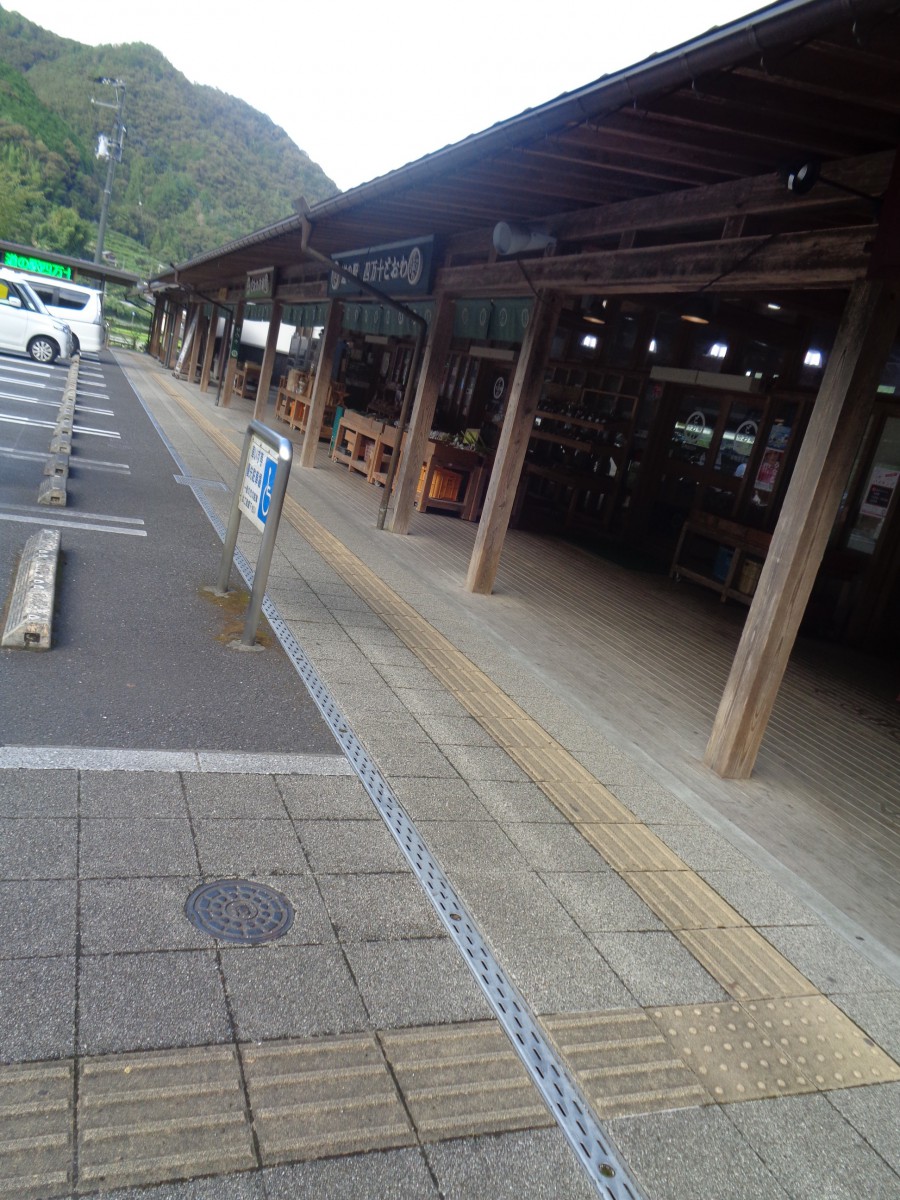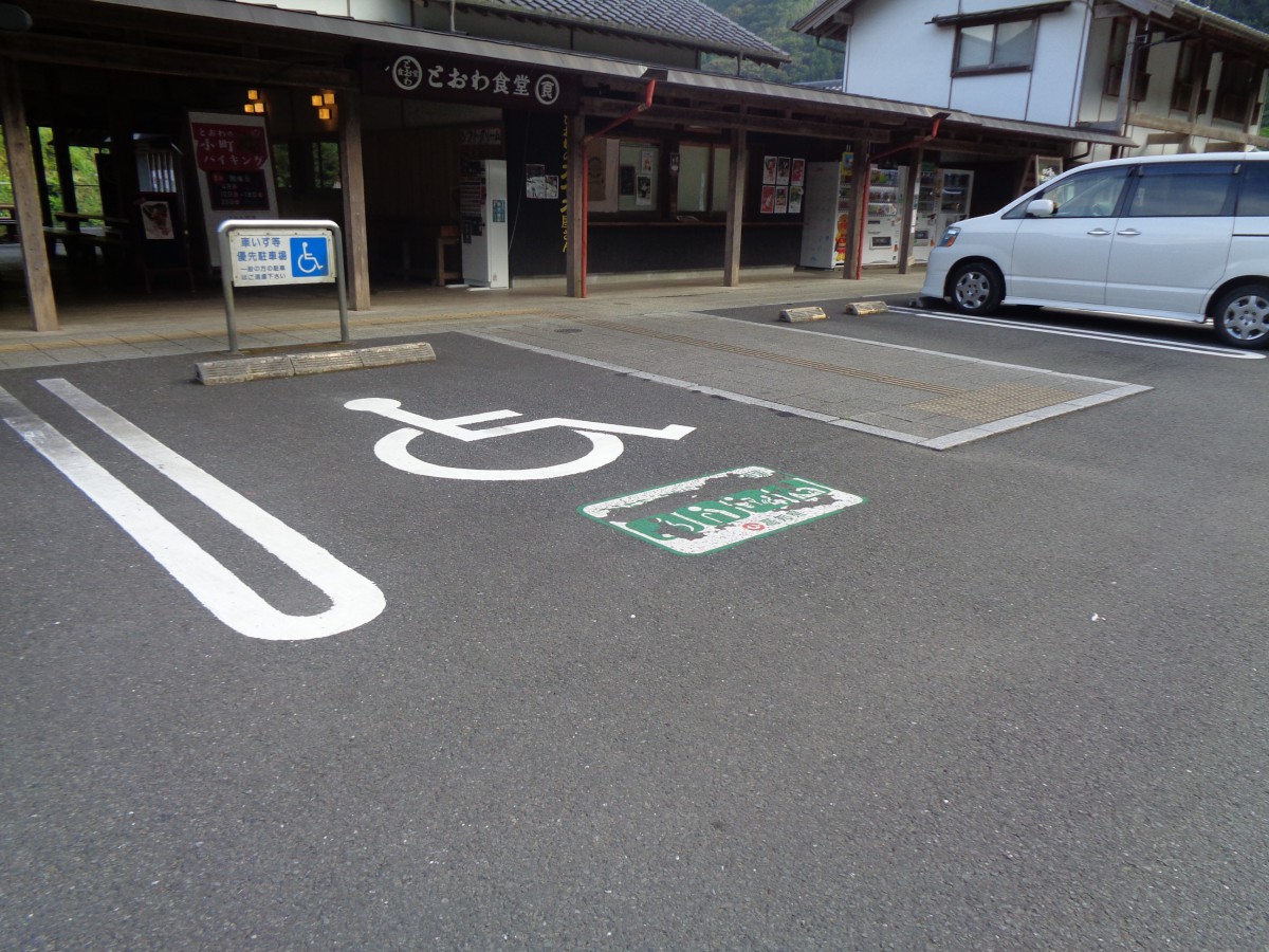 とおわ市場前に1台分 こうちあったかパーキングあり すぐ近くに建物の入口がある JR大正駅と道の駅とおわを巡回する町営バス(ノンステップ、車いす対応)があり、駐車スペースは駐車場北側にある