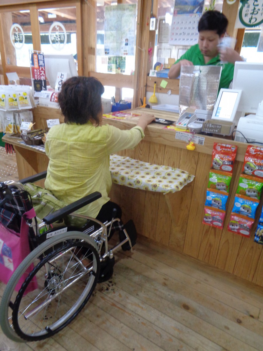 とおわ市場内 レジの高さ92.5センチ 荷物置きの高さ67センチ 店内通路は広く陳列商品も見やすい