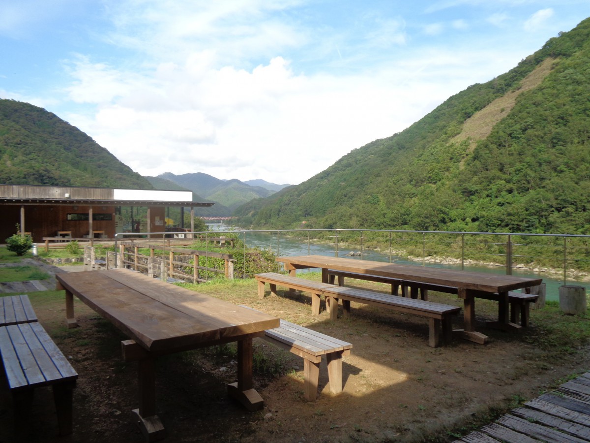 雄大な四万十川の景色が楽しめるテラス席 とおわ食堂で注文したメニューの他、とおわ市場で購入したものも食べることができる