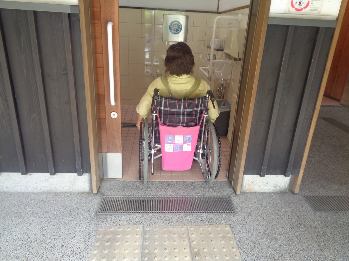 車いす対応トイレ 駐車場西側 入口直前まで点字ブロックあり スライド戸 入口幅94センチ 段差なし