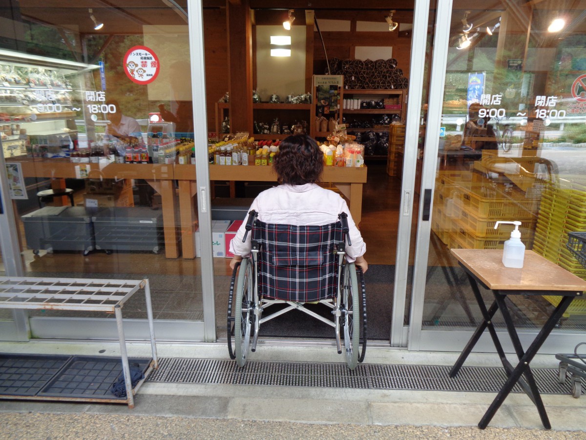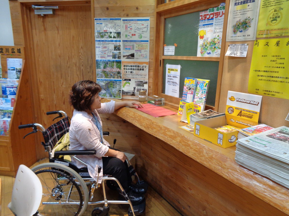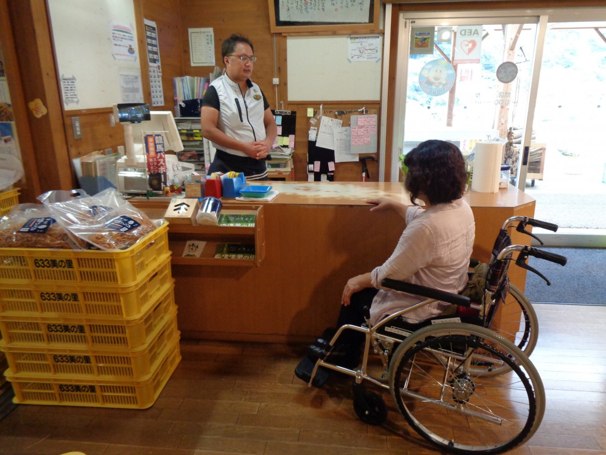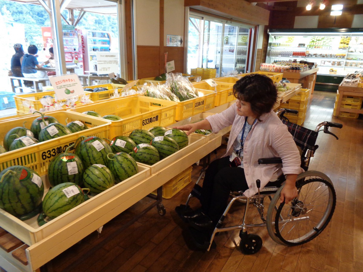 物産コーナーには地元の農産物や特産品がたくさん並ぶ 車いす利用者でも手の届く高さ