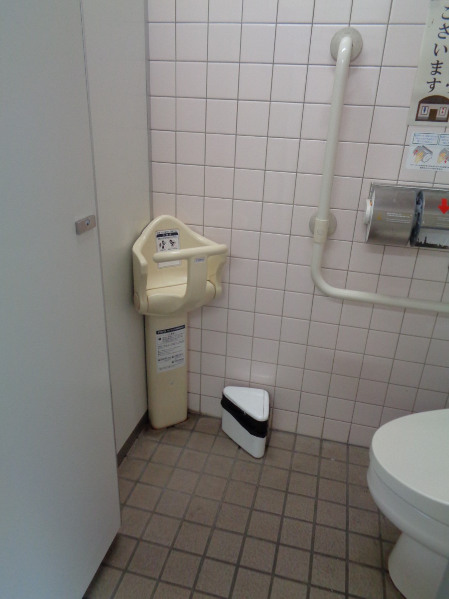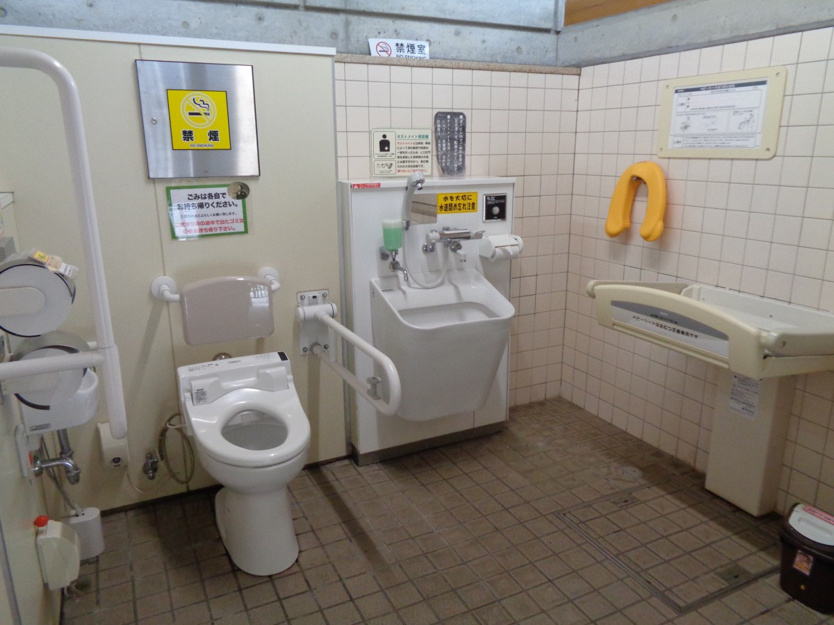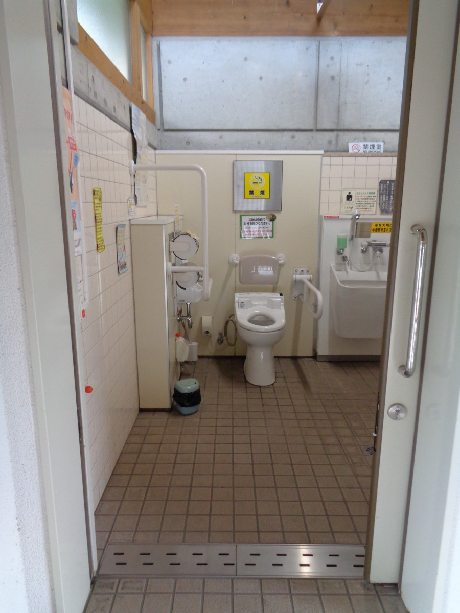 屋外トイレ棟にある車いす対応トイレ 設備はベビーシート、オストメイト対応設備あり