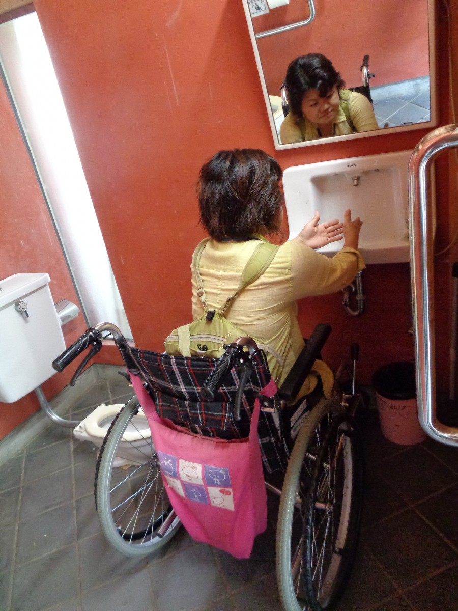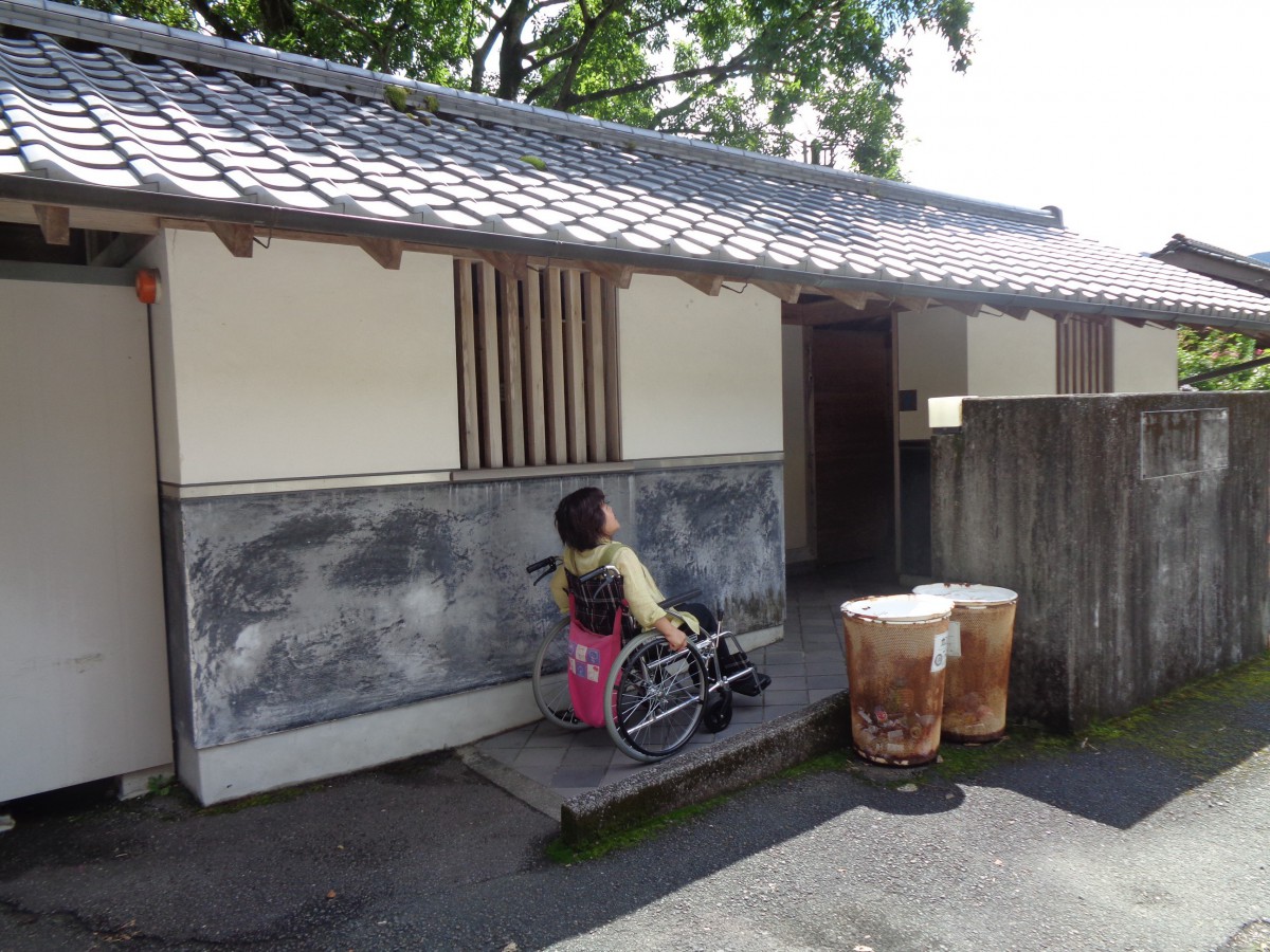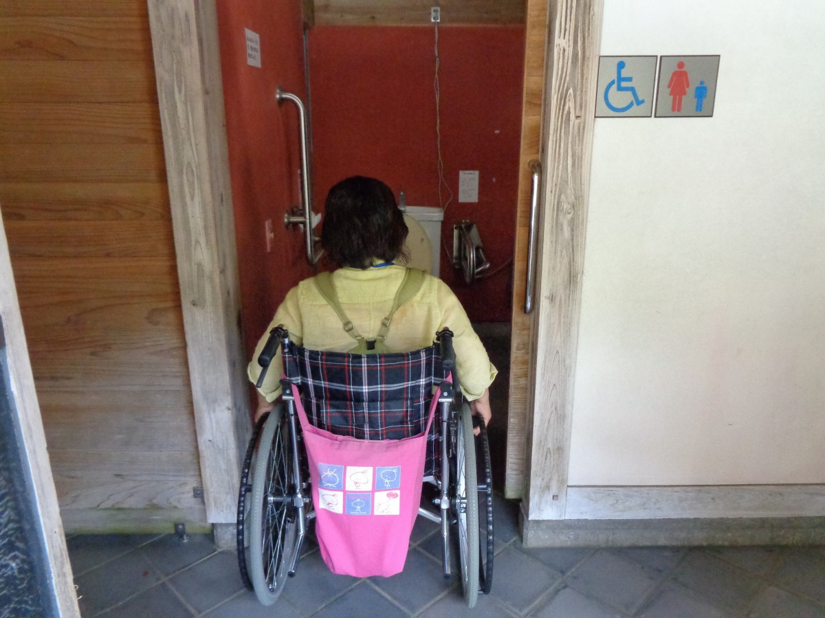 車いす対応トイレ入口 スライド戸 入口幅82センチ 現在、鍵が壊れているので注意