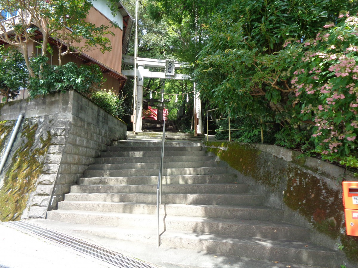 料金所前から八坂神社境内まで30段の石段 中央に手すりあり