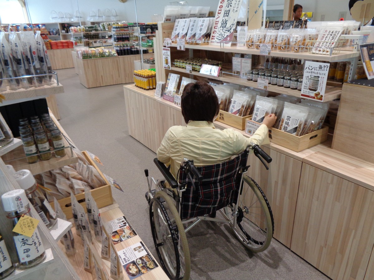 館内通路の様子 通路幅はやや狭め 地元食品や宗田節加工品などが充実