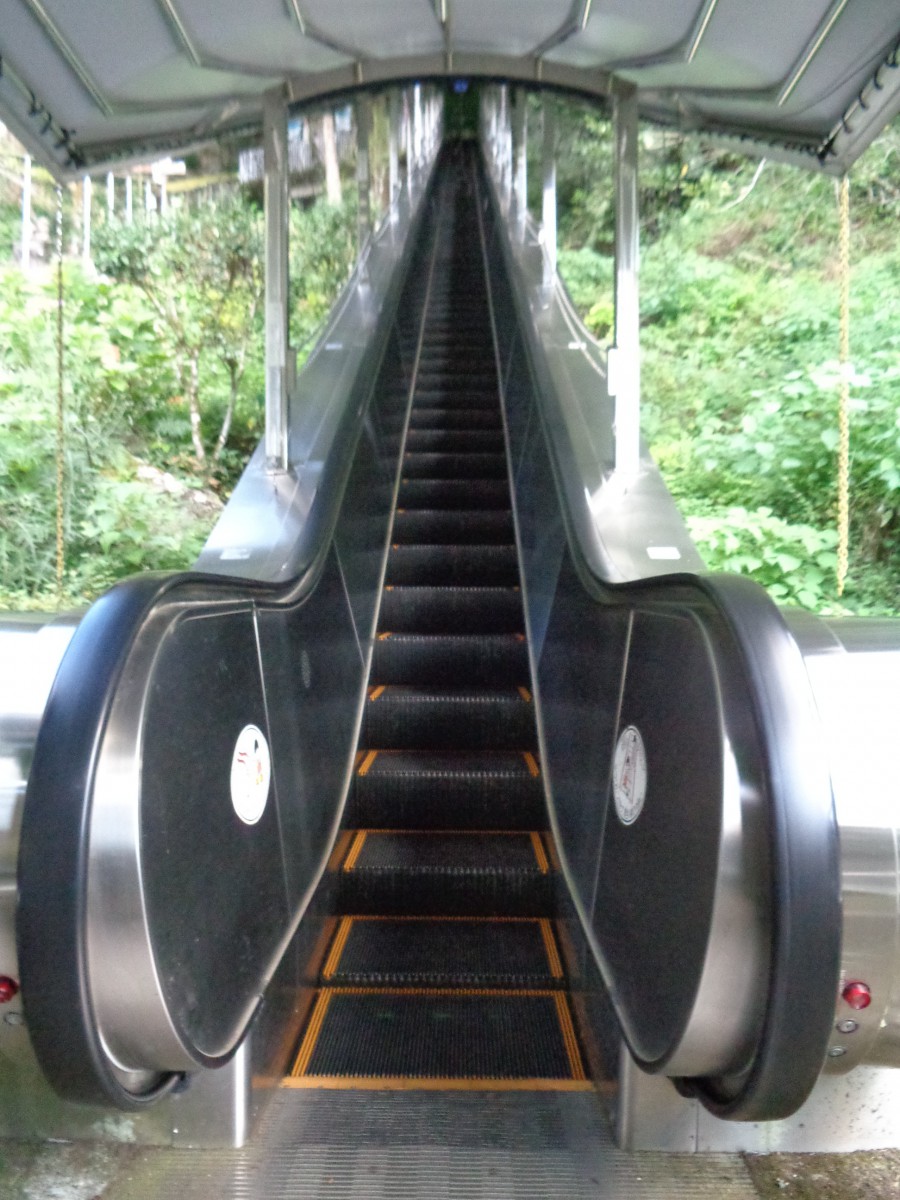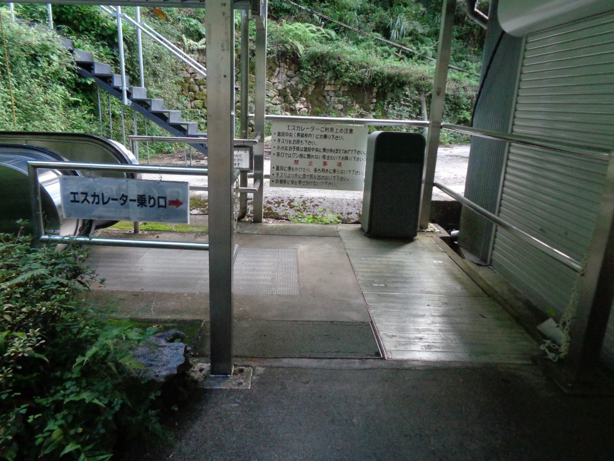 商店街路のつきあたりが鍾乳洞への上がり口 5段の石段を上がった先にエスカレーターと大階段がある 階段には手すりあり