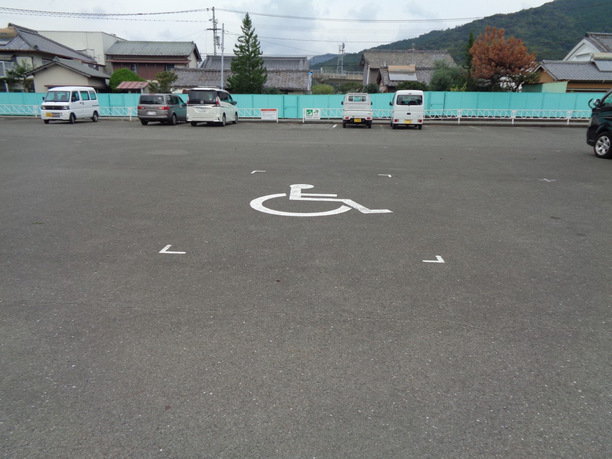 身障者用駐車場1台 駐車場は広いので、建物前で一時停車して乗降した後、車を移動させるとよい