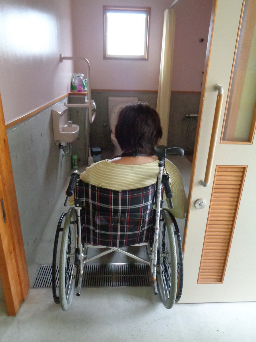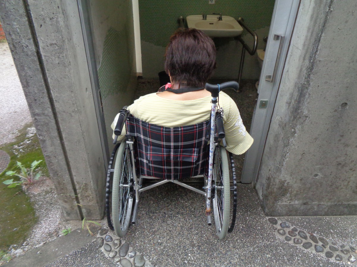 車いす対応トイレ入口 スライド戸 入口幅92センチ 駐車場からトイレの入口まで段差や路面がガタガタしている箇所があるので注意