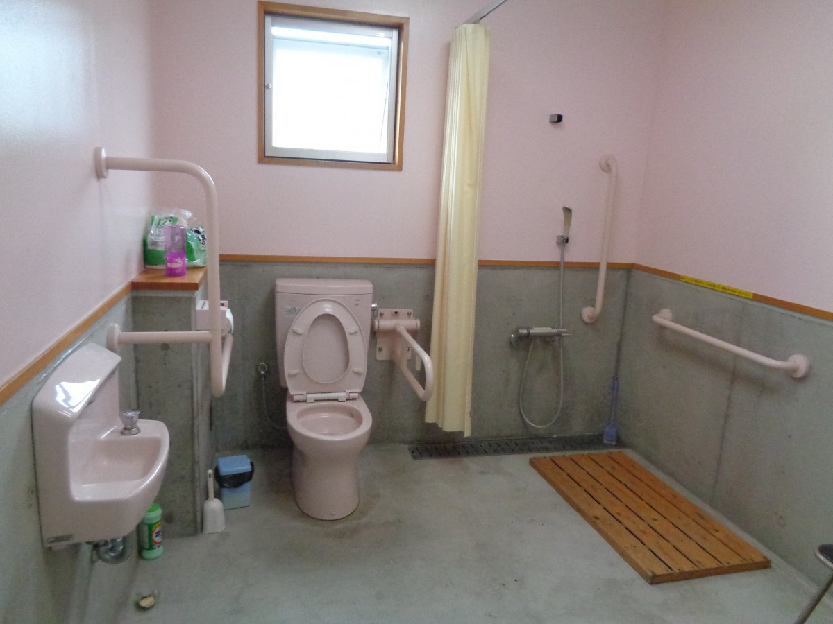 車いす対応トイレ内 設備 手すり右側U字 左側L字 シャワースペースあり 壁面に手すりあり
