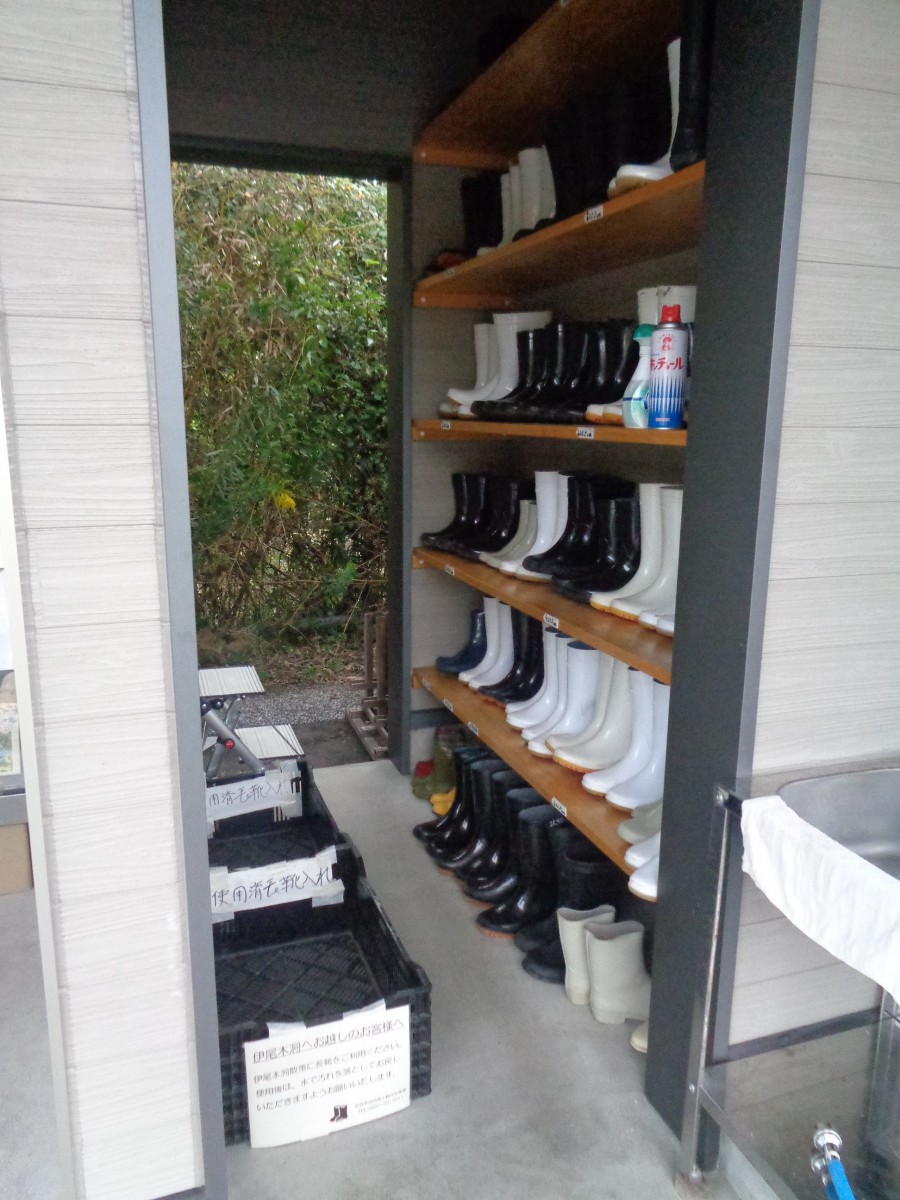 洞内を散策する時に利用できるヘルメットと長靴を無料貸出している